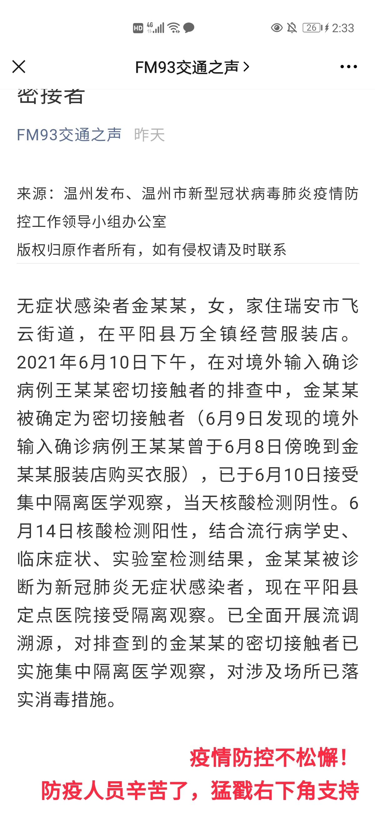 温州最新通报!发现1例本土无症状感染者,系境外输入确诊病例密接者