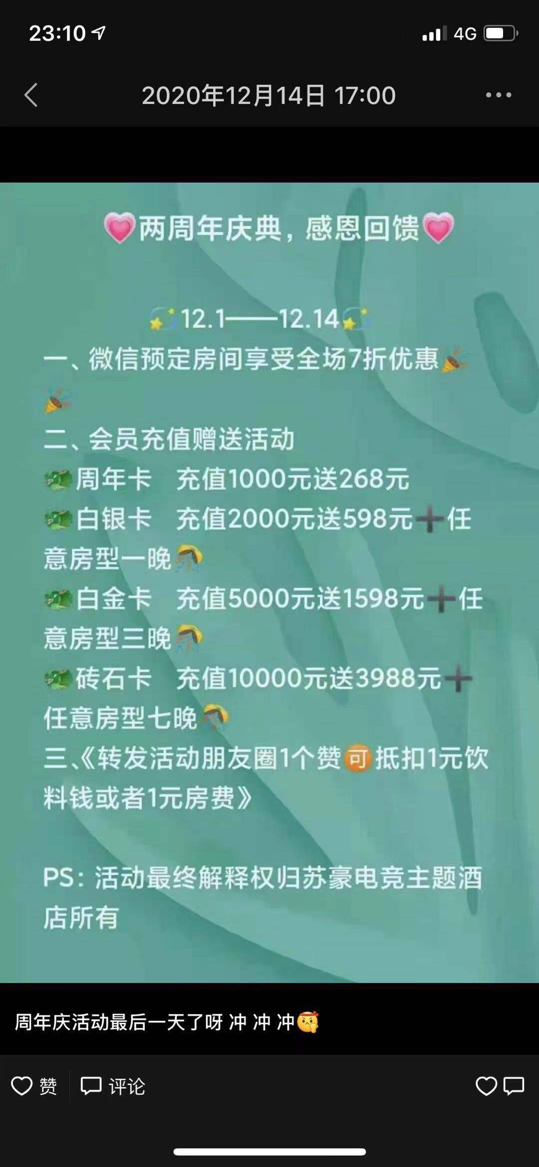 2020年12月份苏豪电竞宾馆做活动,就和朋友充了2000块,活动的内容有两个,第一个是微信订房间7折,然后充2000送598和任选任意房型一间。昨天朋友想过去消费那间免费房间,前台跟我说是598或一间,开始不认账。然后除了第一次给我7折的房间后,后面一次优惠都没有。他有两家门店,在白象洲际酒店有一家,当时充会员的时候说是两家的店可以通用,现在又出尔反尔说从来不行。现在微信发给老板,也是回都不回。都是乐清的年轻人,现在做生意还那么不诚信,做不起活动就别做,早点关门好了