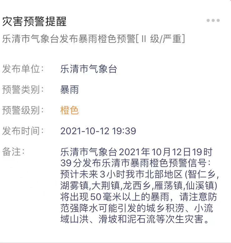 乐清发布橙色暴雨预警!
