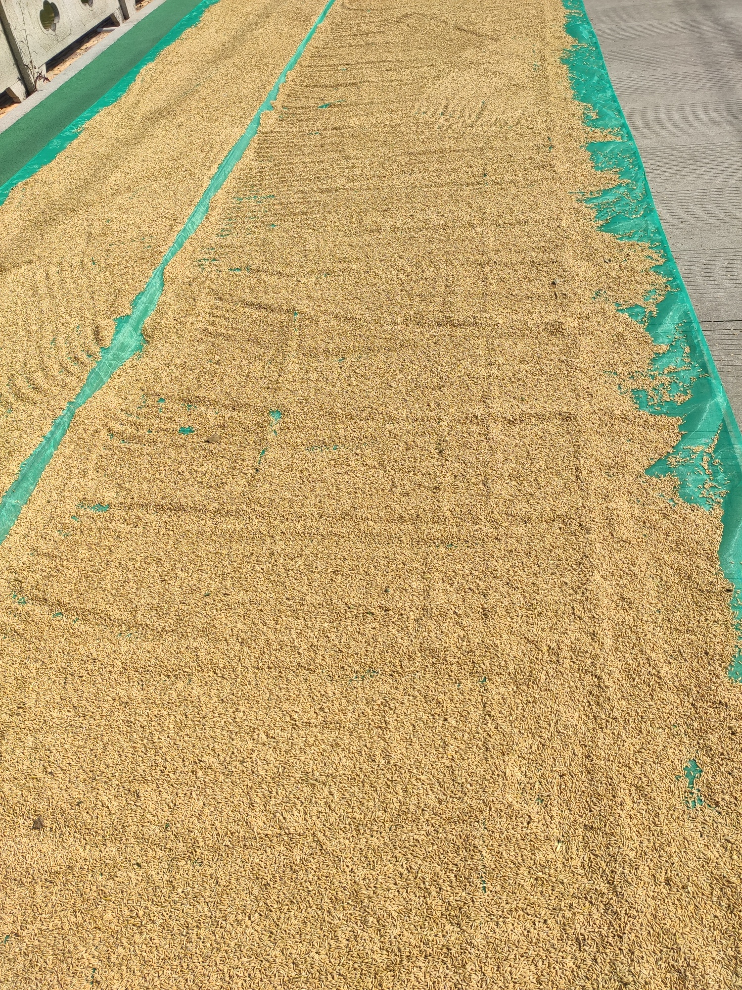 10月3日晴天,拉出来晒了一天,10月4日早上4.5点拉出来晒,可是天公不作美,8点就开始下雨雨,全家人还叫了一个邻居帮忙,结果前一天刚晒干了一点的稻谷不能幸免的被淋湿了。其中的心酸只有种田人知道吧。