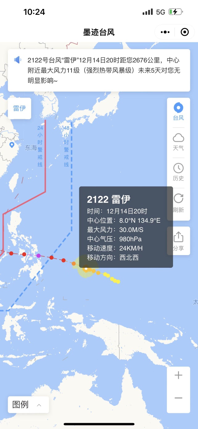看到一个消息,今年第22号台风“雷伊”已经在菲律宾生成了,最强可达14~16级,而且继续向西偏北方向移动,不知道会不会登陆我国,但是海南、广东、台湾、福建那边都可能会有降雨!
