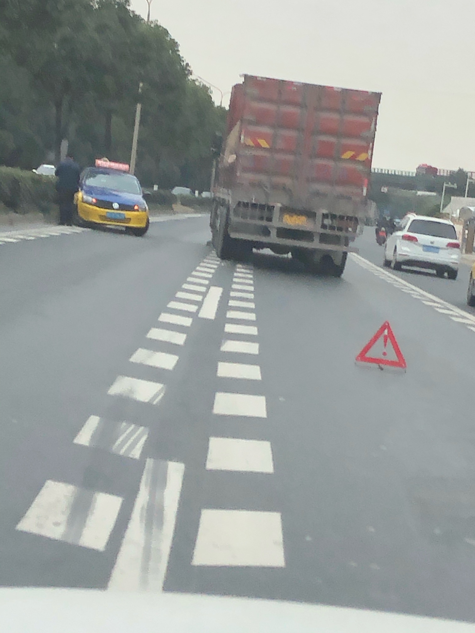大货车水箱都撞漏了,出租车都上绿化带了。