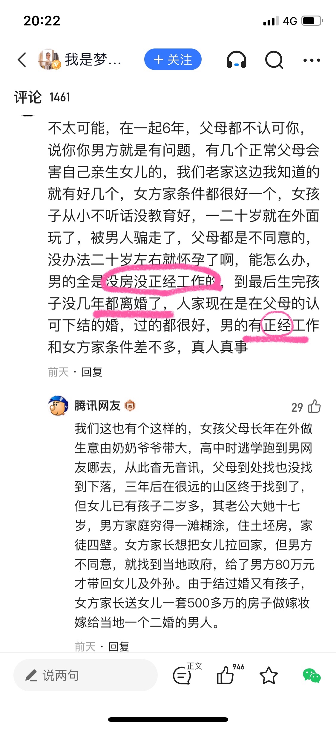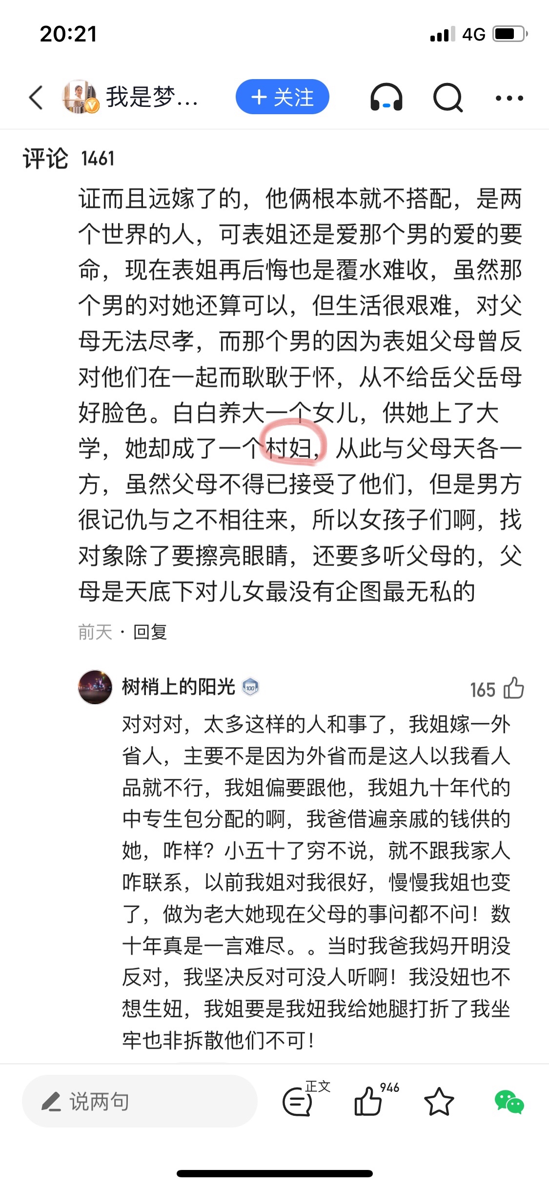 因为第一张图的新闻看到的后面3张评论截图,1.“村妇”[白眼]我乐清是县级市,那么嫁过人的女人都是村妇么,那么村妇是多低等的称呼。应该是我们不够努力,是祖宗十八代没有在大城市扎根的原罪么,且我是女人2.“没正经工作”,在生活中大家普遍认为公务员事业单位老师医生军人等工作的是正经工作。古时,商人也是下等人!那得多少人都是不正经没希望的人生3.不是不选的问题,是钱的问题。有钱,哪个关系都好。我应该符合1、2、3点,我是个没有正经工作的穷村妇(生没生孩子都没关系只要满足百度百科中妇女的含义就行)我得多低等[微笑][捂脸]卷到没地方卷。