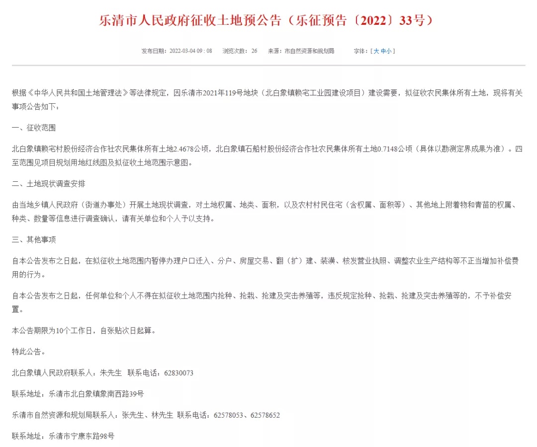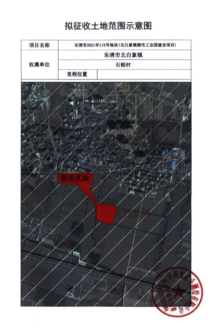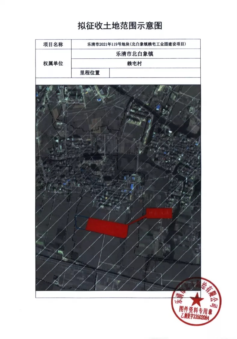 因乐清市2021年119号地块(北白象镇赖宅工业园建设项目)建设需要,拟征收农民集体所有土地。