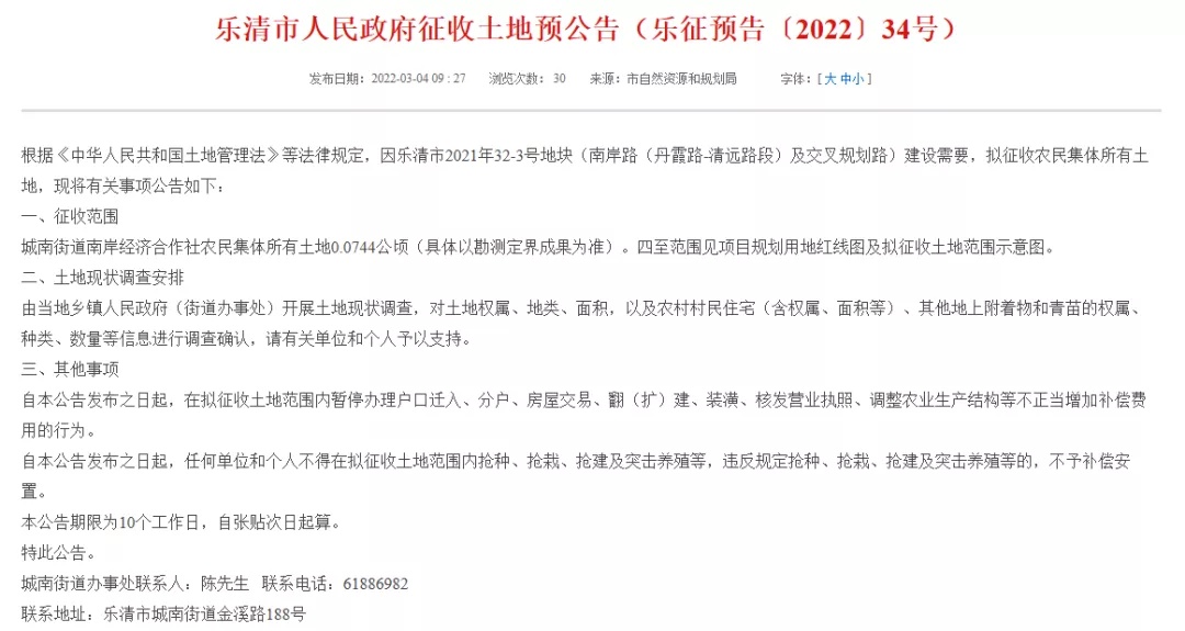 因乐清市2021年32-3号地块(南岸路(丹霞路-清远路段)及交叉规划路)建设需要,拟征收农民集体所有土地。
