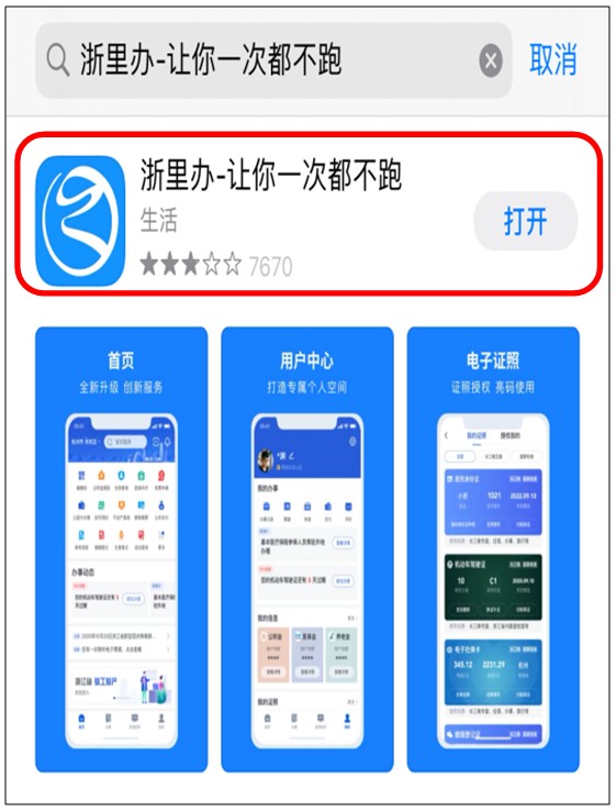 (安卓手机到手机应用商店中搜索“浙里办APP下载安装”;苹果手机到App Store中搜索“浙里办”APP下载安装。)