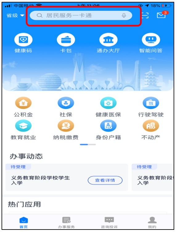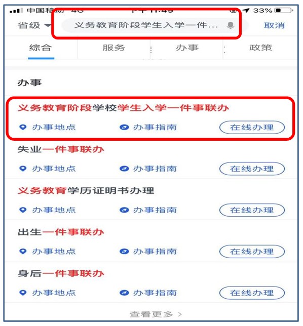 学生家长注册“浙里办”后登陆到“浙里办”APP,并实名认证,在“浙里办”页面顶部搜索栏输入“义务教育阶段学校学生入学一件事联办”并点击弹出的“义务教育阶段学校学生入学一件事联办”(图1),然后再点击“在线办理”(图2)
