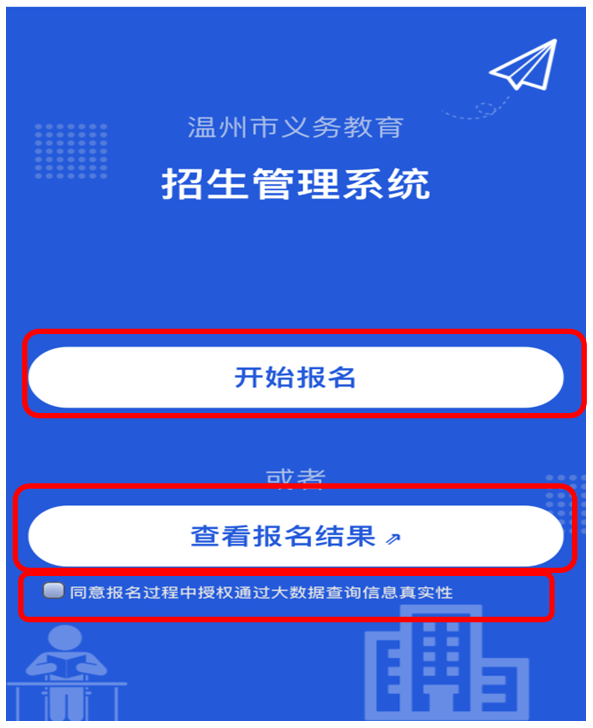 适龄儿童、少年家长需提前在手机上,下载并安装“浙里办”APP,搜索“义务教育阶段学校学生入学一件事联办”,点击“在线办理”,选择“浙江省→温州市→乐清市”进行入学报名,并在规定的时间内查询报名登记和资格审核、录取结果等信息。