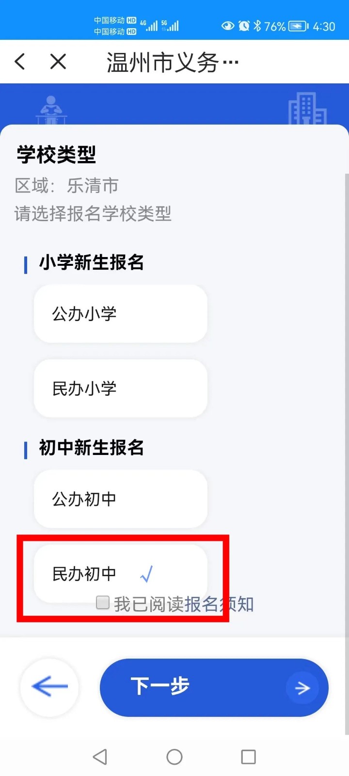 ☞2.点击“学生所上学的学校所在区域”后,再点击“下一步”→选择“转公”类小学、初中或公办小学、初中或民办小学、初中→勾选“报名须知”→点击“下一步”;