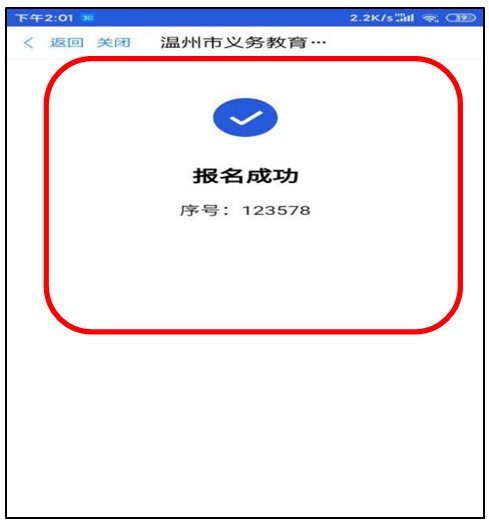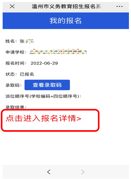 点击“返回”箭头,退回到“温州市义务教育招生管理系统”,点击“查看报名结果”,可以查询“我的报名”具体信息。
