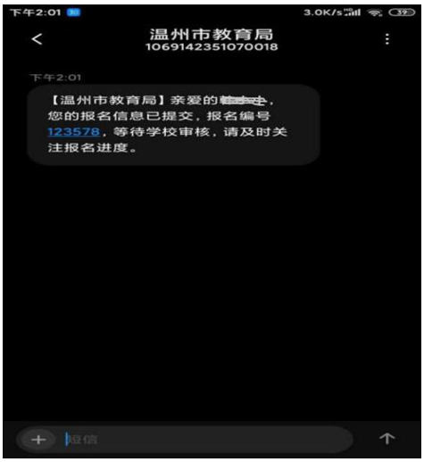 填写完信息后,点击提交,会提示报名成功,并以短信提醒方式发送至报名表中的“监护人1”的手机上(如下图)。请家长务必记住“监护人1”的手机号码,并及时查看“报名结果”。