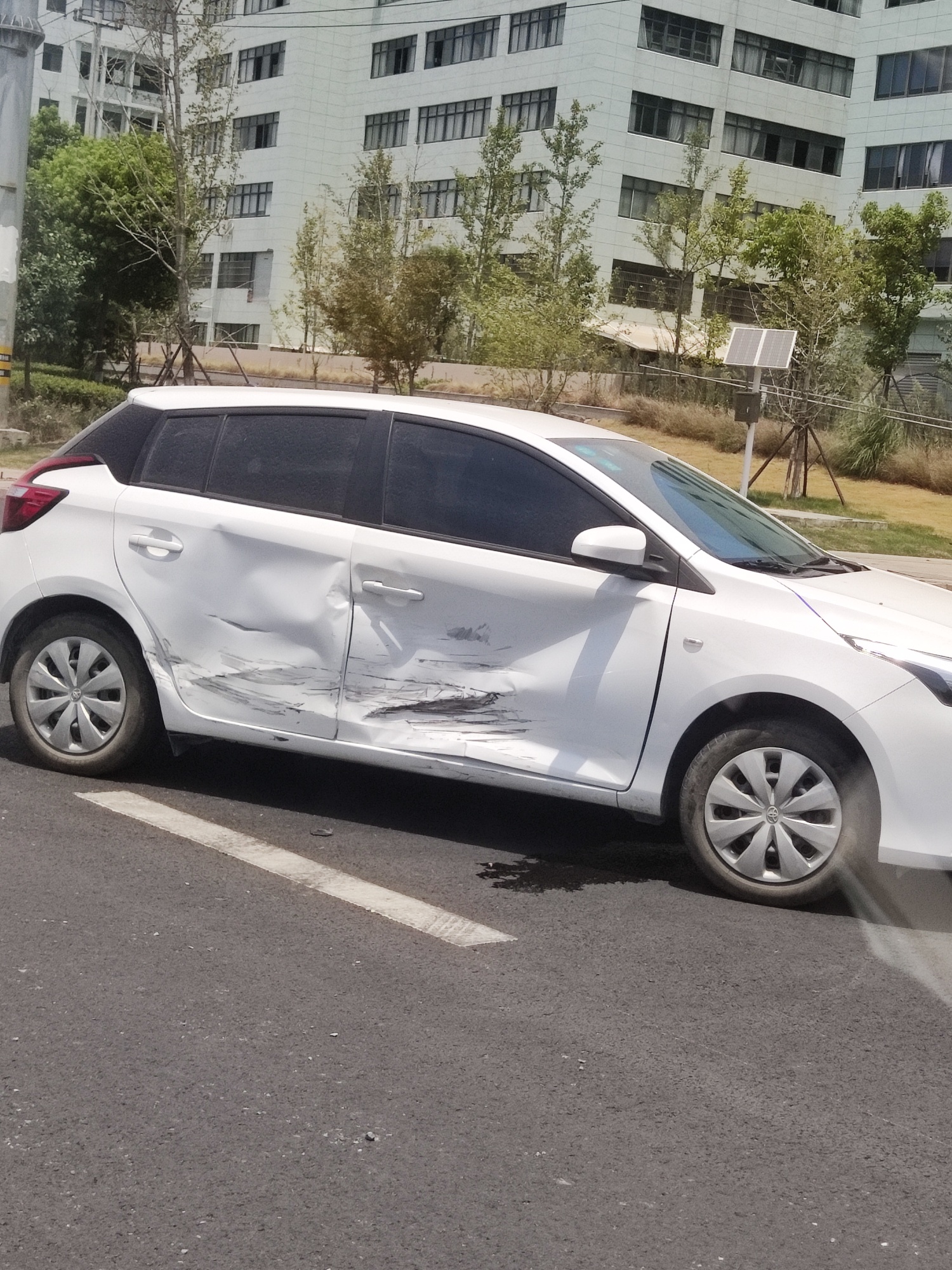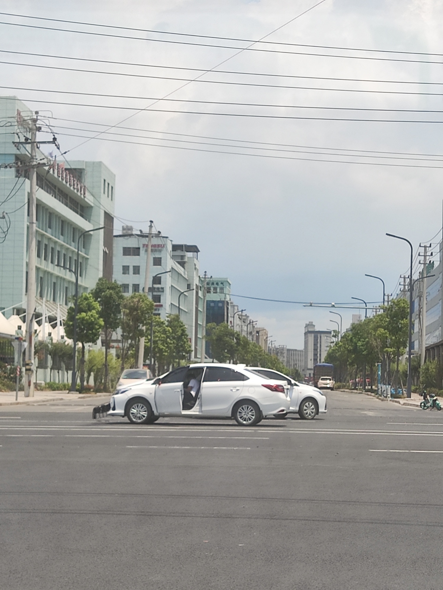 两辆白色 车相撞,一车前保险杠受损,另一车车门撞凹进去了