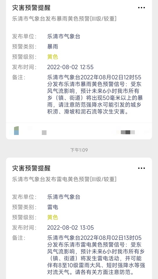 暴雨雷电!刚刚,乐清气象台连发两条黄色预警!