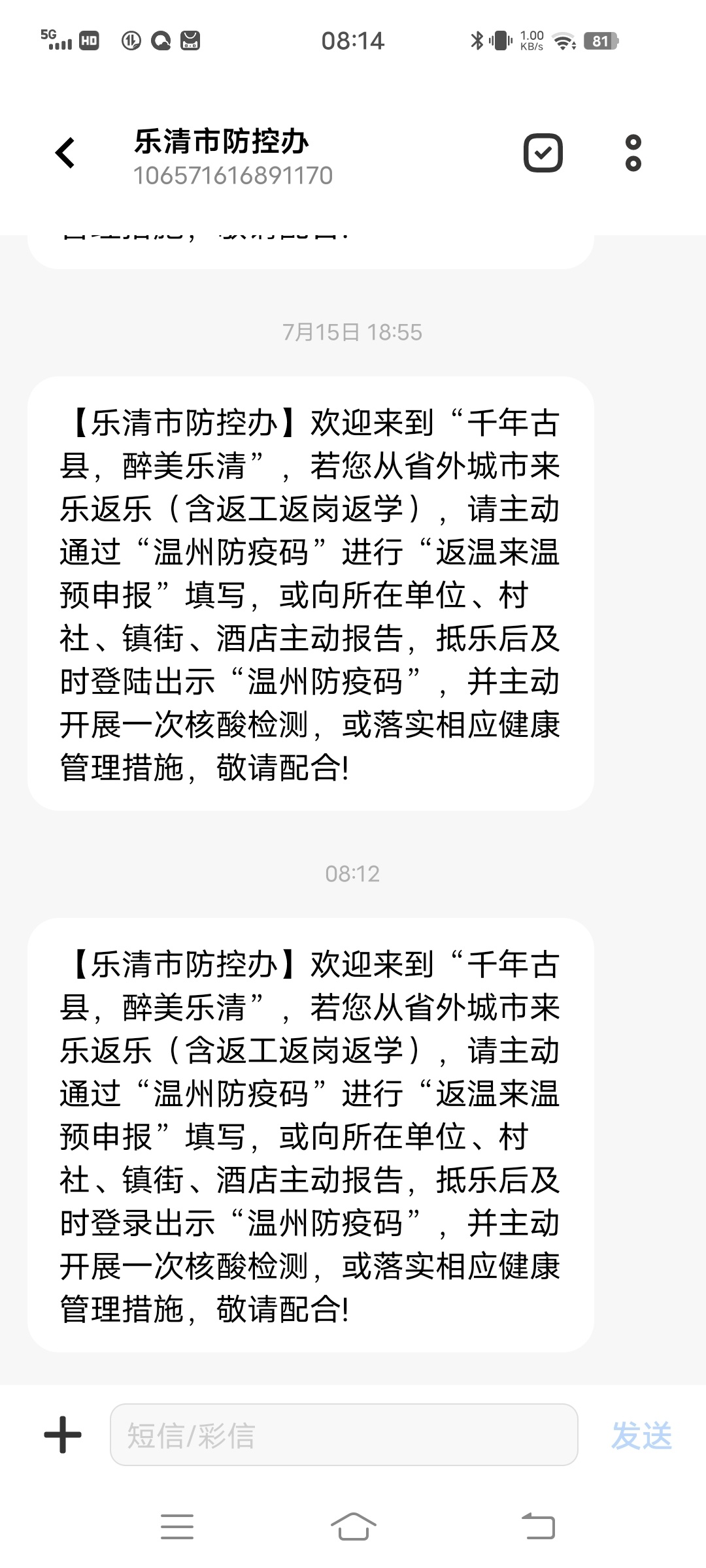 咱大乐清就是有礼貌,时不时的就给我发信息欢迎我