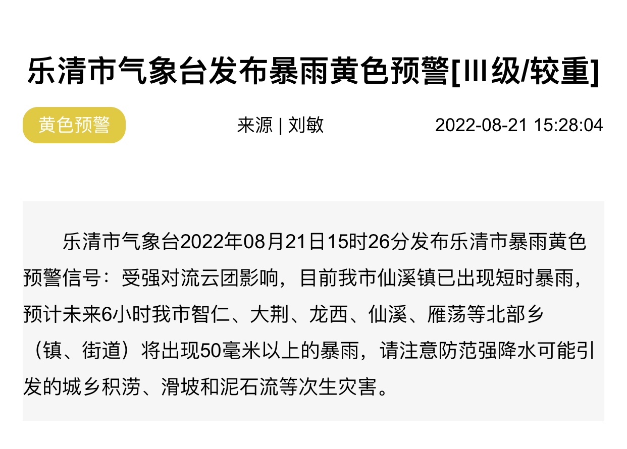 乐清市气象台发布暴雨黄色预警