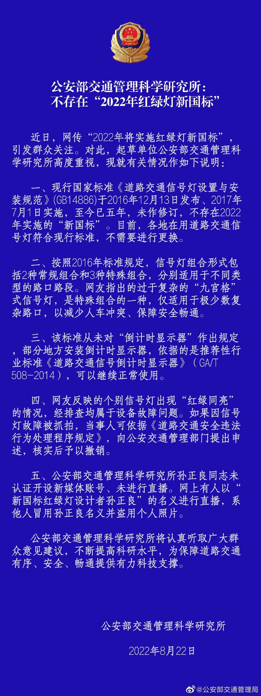 公安部门回应:不存在“2022年红绿灯新国标”