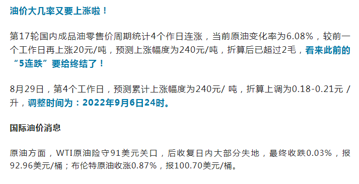 8月29日,第4个工作日,预测累计上涨幅度为240元/ 吨,折算上调为0.18-0.21元 / 升,调整时间为:2022年9月6日24时。