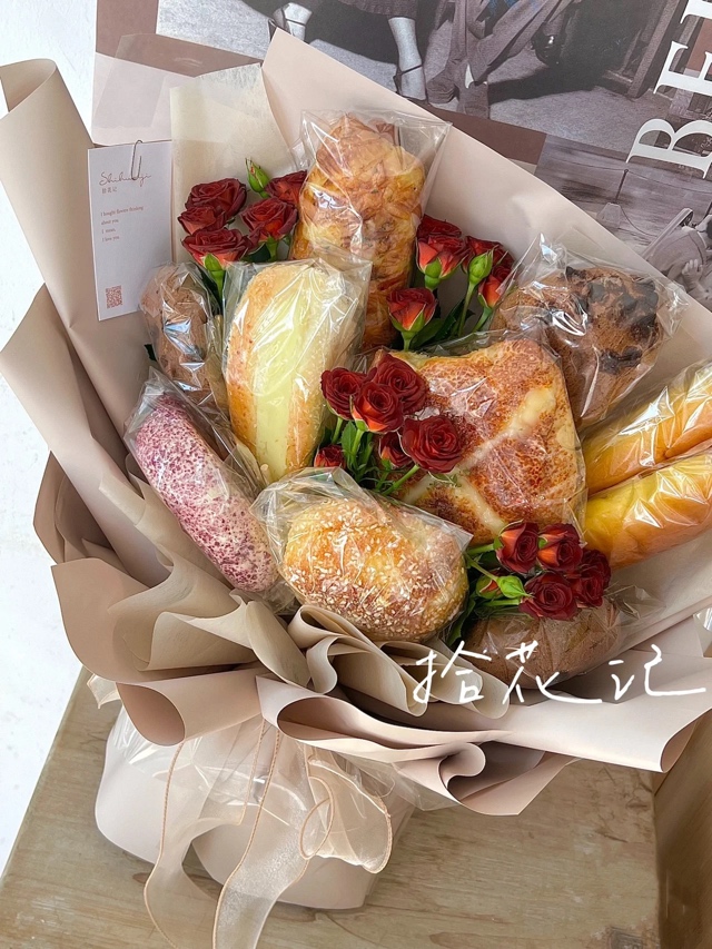之前的零食花束、养乐多花束,草莓花束……今年的面包花束!