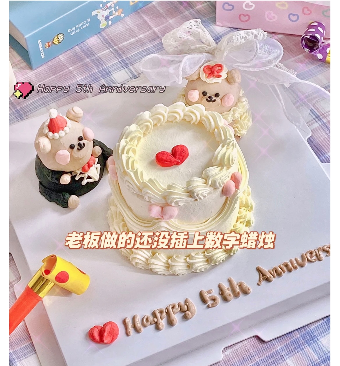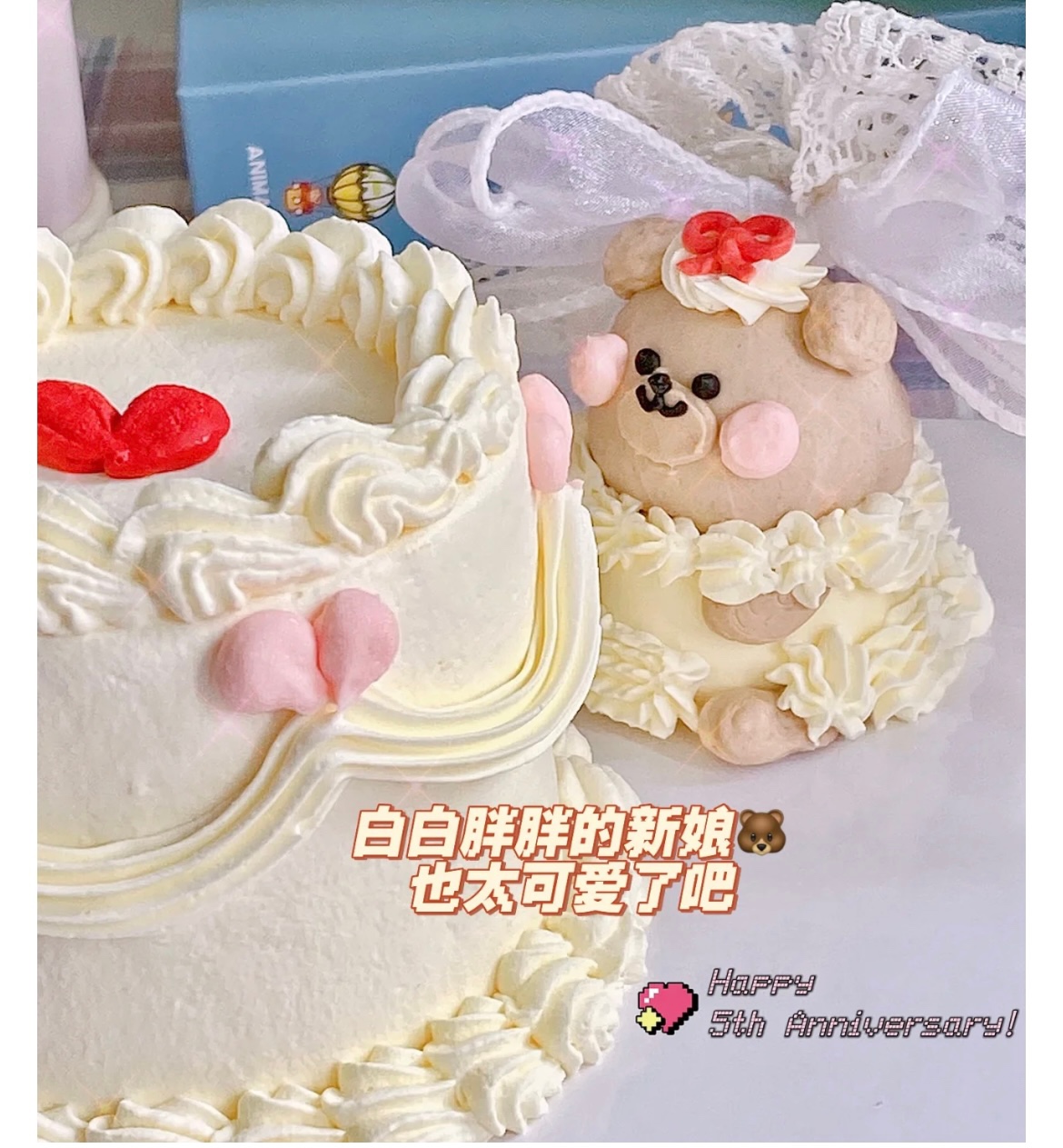 问了好几家当地蛋糕店,都说尺寸太小了不好做,建议中间蛋糕做成4寸~5寸(可是就是要mini小小个才可爱呀,而且两个人吃不完)要不就是以两个立体奶油熊难做要求加价,我哭~