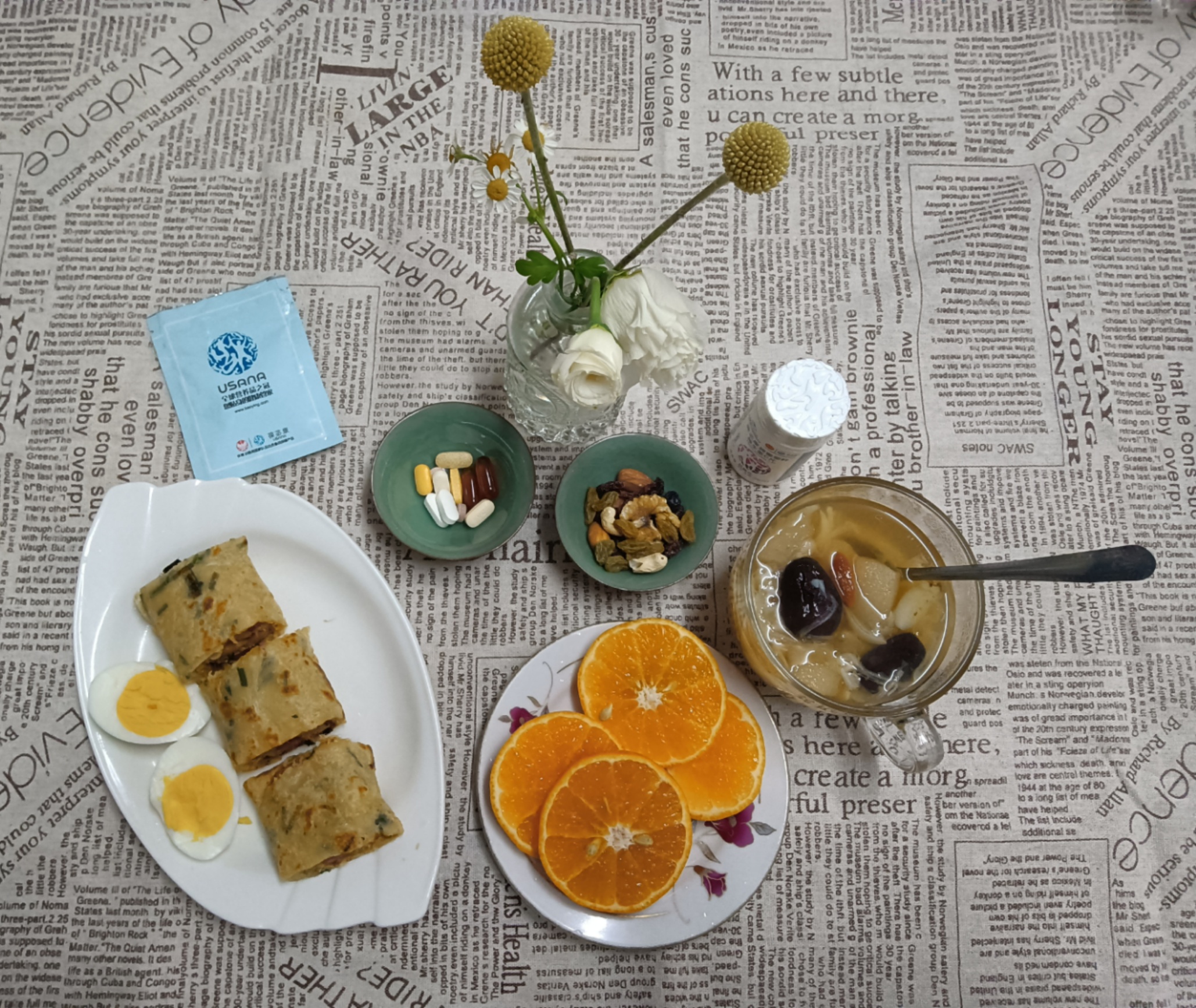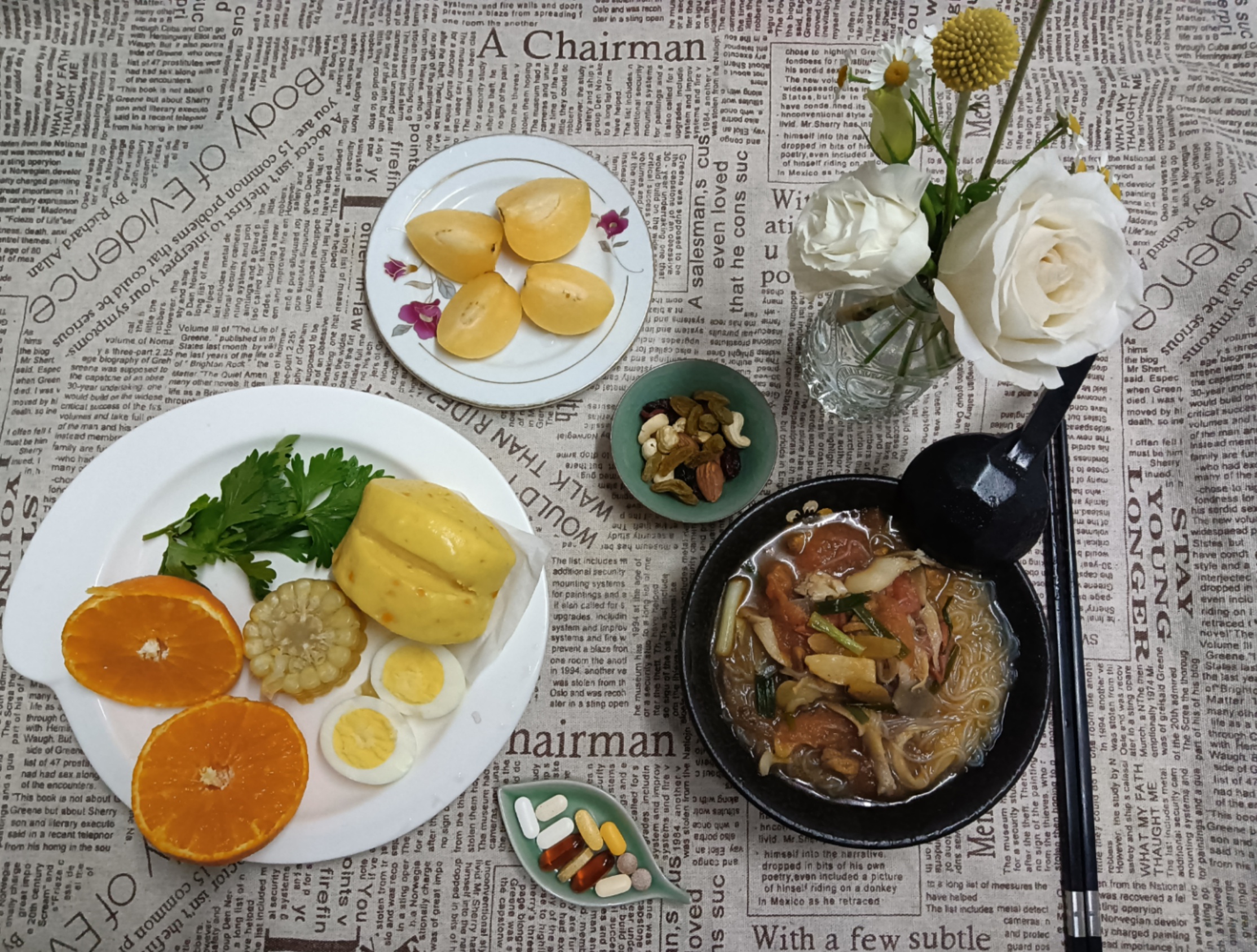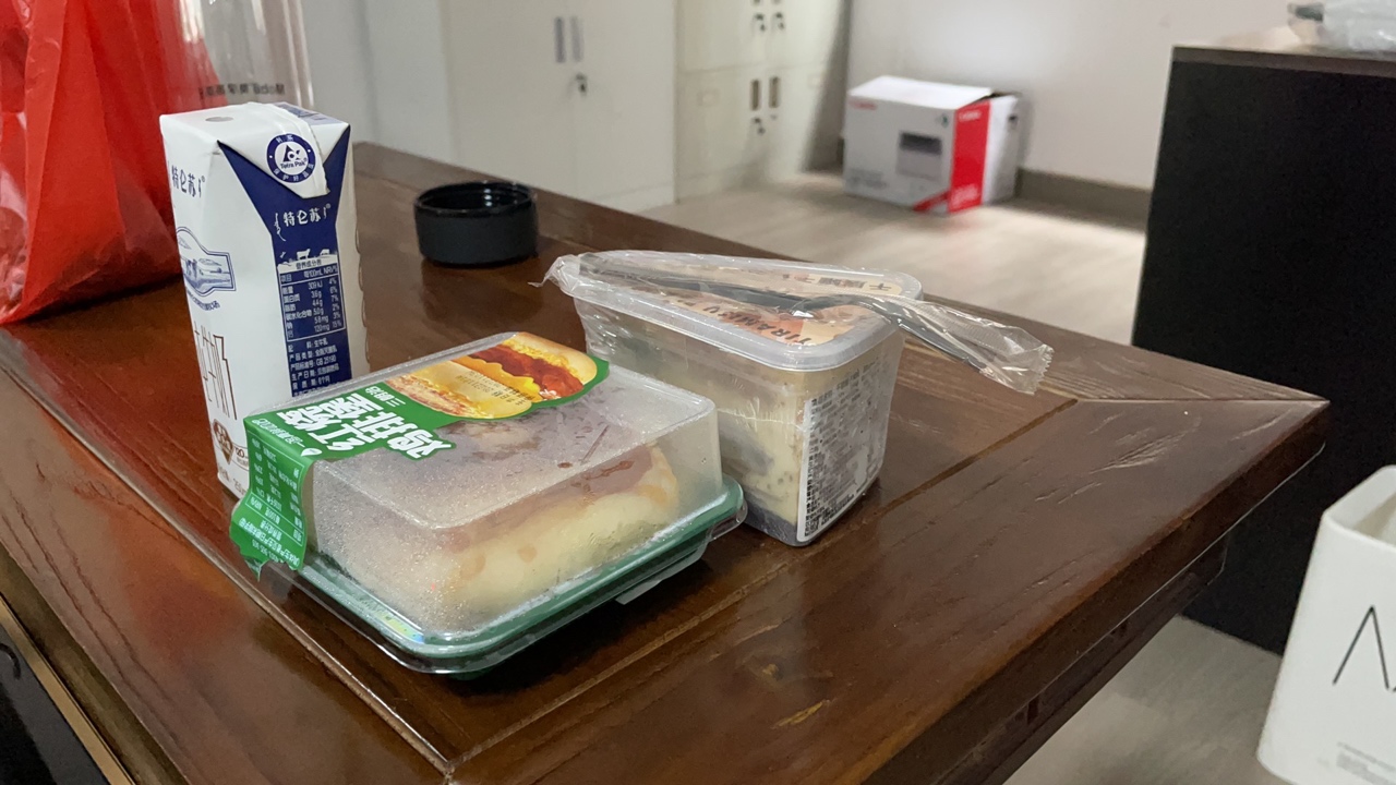 早上吃了一碗糯米粉+两个茶叶蛋+一杯豆浆。