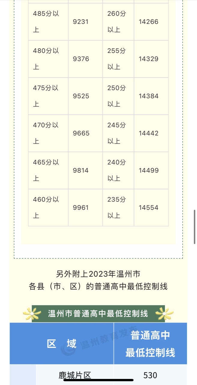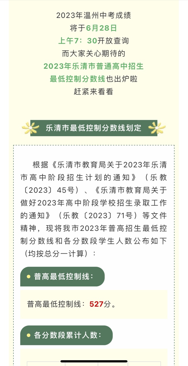 刚刚!2023年乐清普高招生最低控制分数线及各分数段学生人数出炉