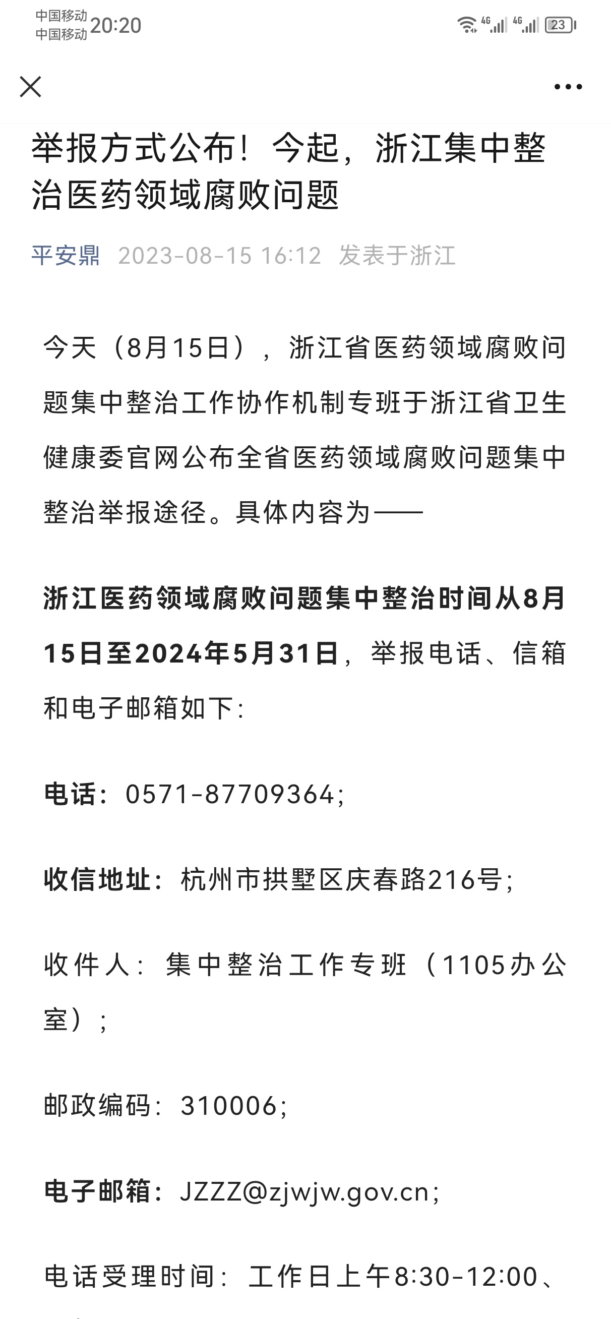 浙江医药领域腐败问题集中整治时间从8月15日至2024年5月31日,举报电话、信箱和电子邮箱如下:
