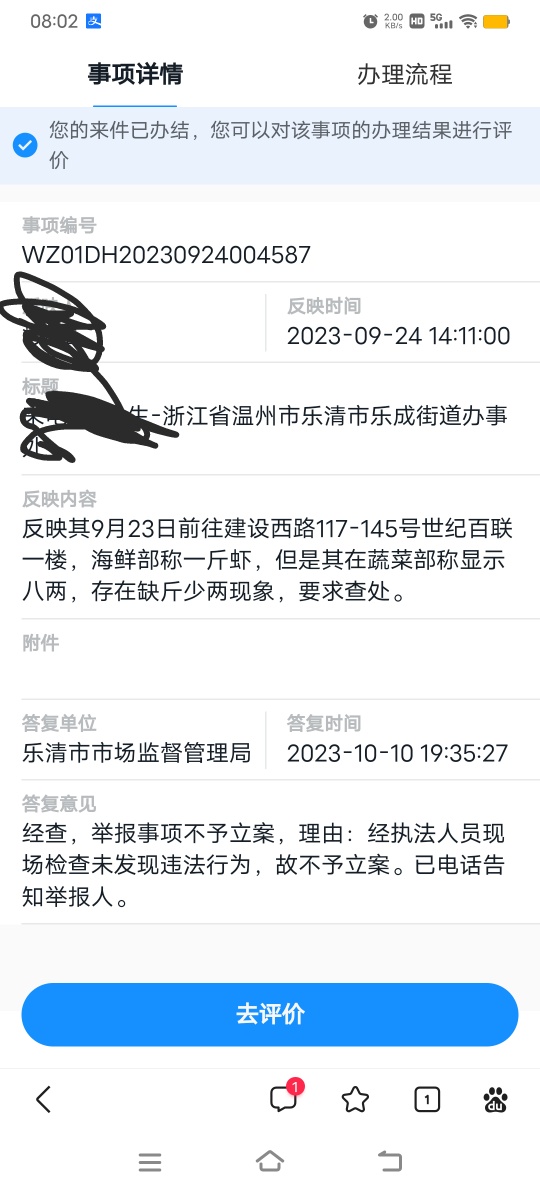 最后的通话举报结果就是 8两秤是偶然情况,给我秤的时候可能有东西 没有主观上故意不法行为 不于立案 电话沟通中我也认可处理结果。 最后说下我没找超市要钱要好处 举报之后也有在超市购物 目前没有被打