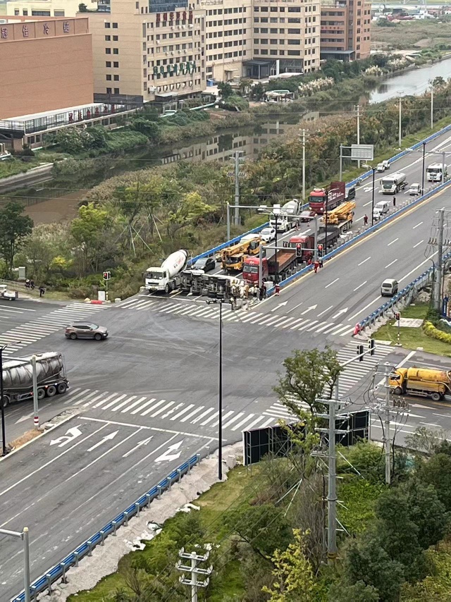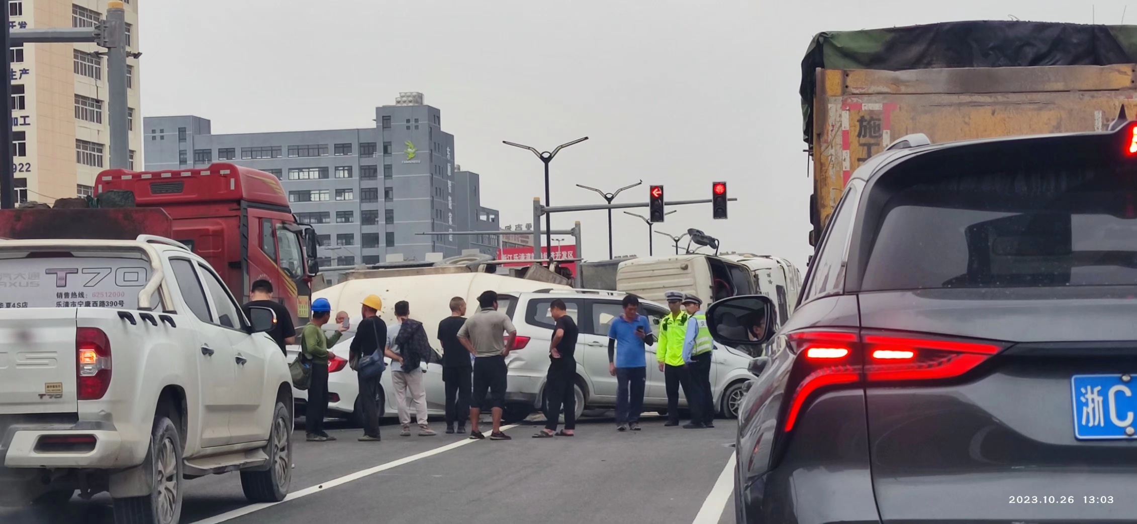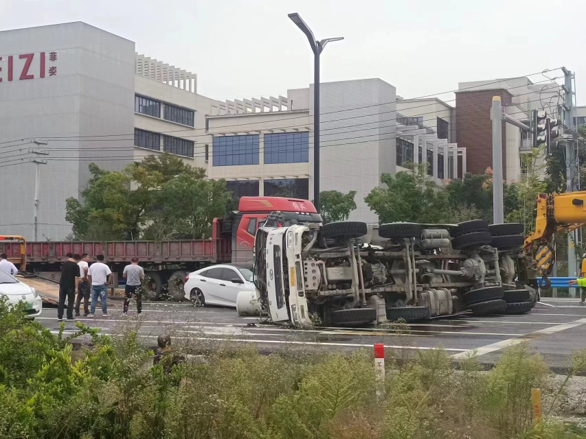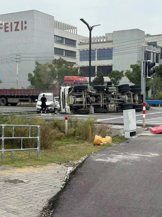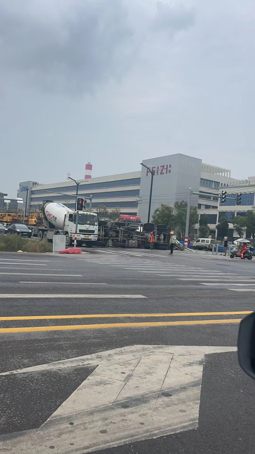 2023年10月26号中午12点多。乐清蒲岐港湾疏港公路,菲姿厂门口有交通事故大堵车,一辆大水泥车翻车。人员伤情还不清楚。