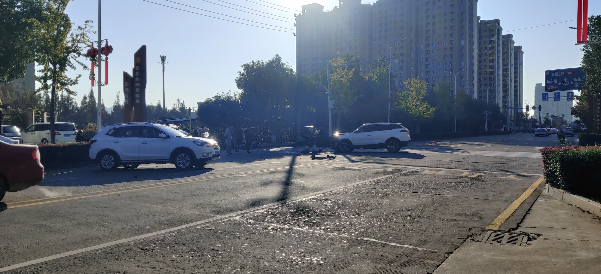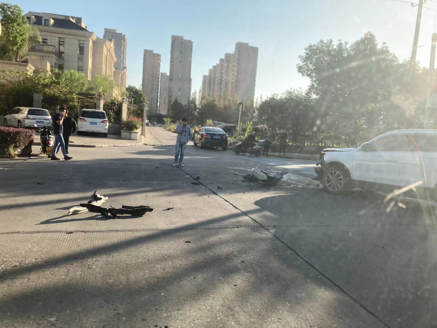 一辆白色SUV车头保险扛撞断了掉地上了,车头撞的有些小严重,地上都是车头撞出来的东西。