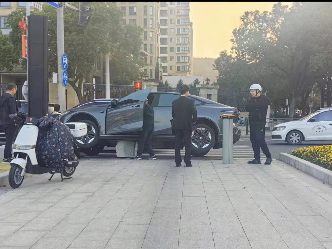 在旭阳路,撞到路边的柱子上了