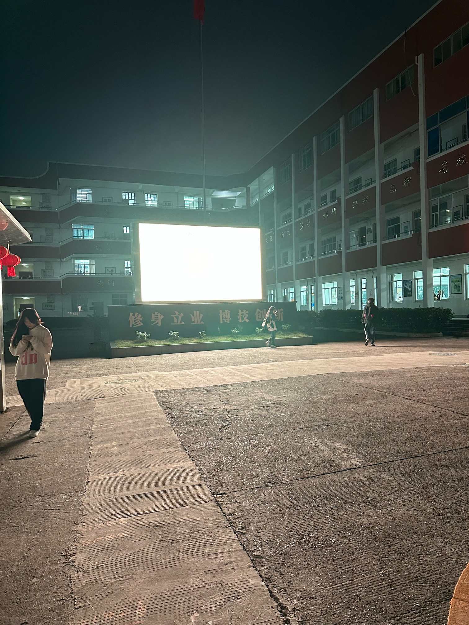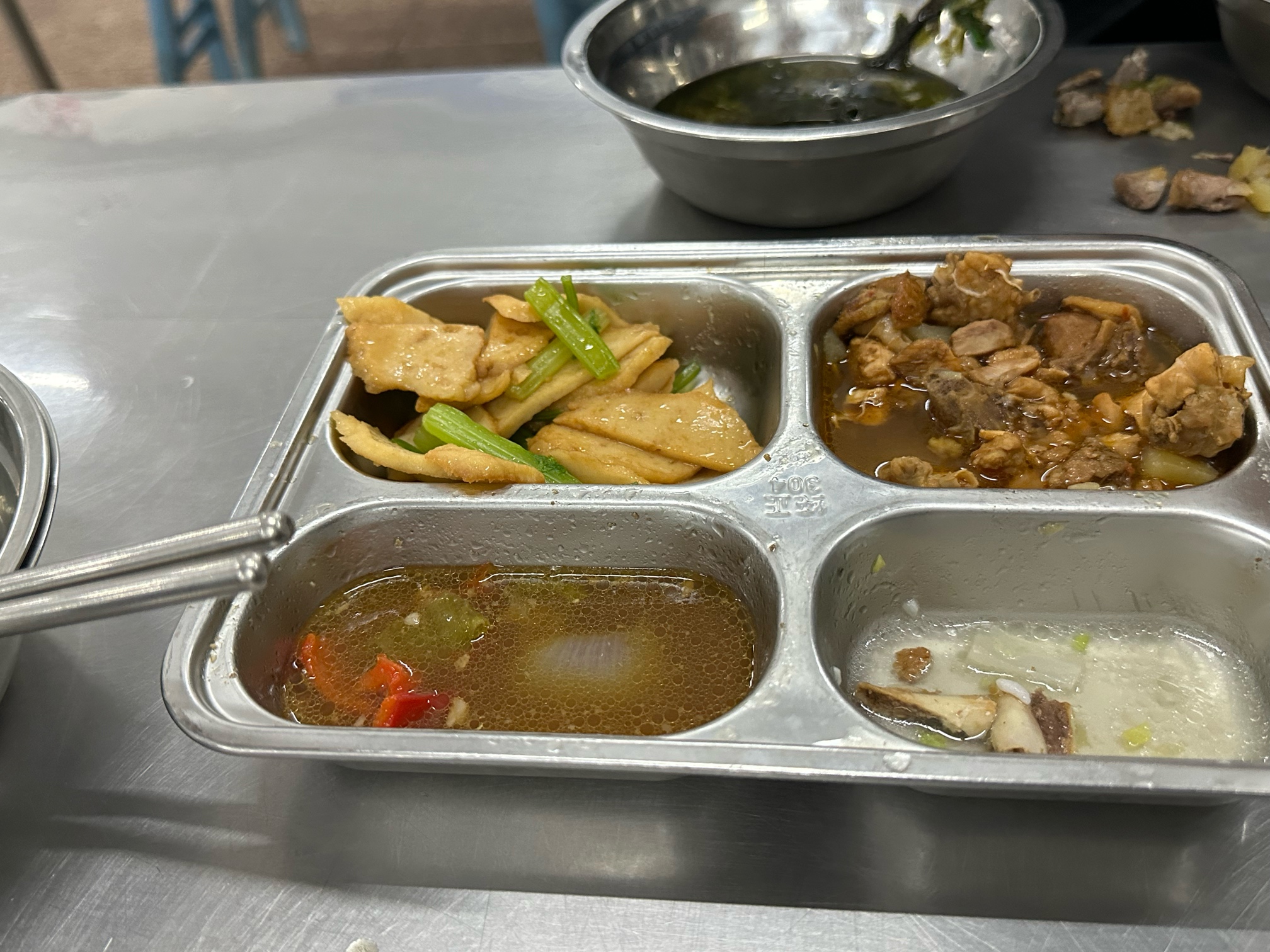 这个学校吃饭是都是发一铁盆伙食的,很多学生宁愿吃泡面也不去食堂,有的么吃一点就全倒了,餐厅时间一到全部的饭菜倒垃圾桶,满满一大盆一大盆的倒感觉挺浪费的,还有门口的LED屏亮的刺眼不用电费似的。。
