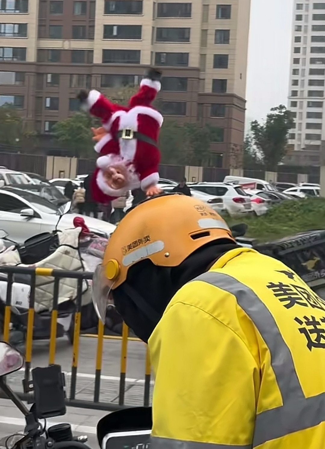连外卖小哥的头盔装饰都升级了,这个老人在头盔上旋转,怪有趣的