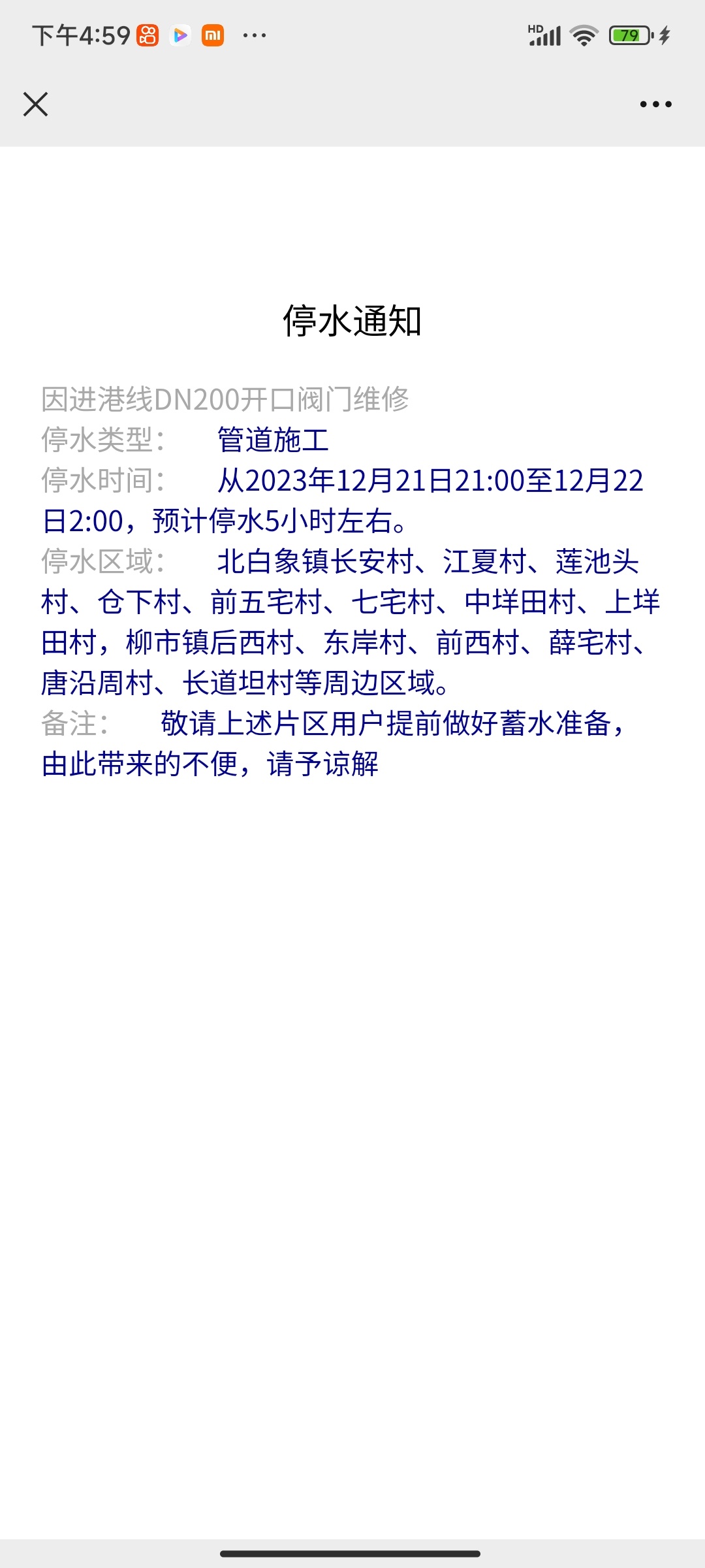 停水时间:从2023年12月21日21:00至12月22日2:00,预计停水5小时左右。