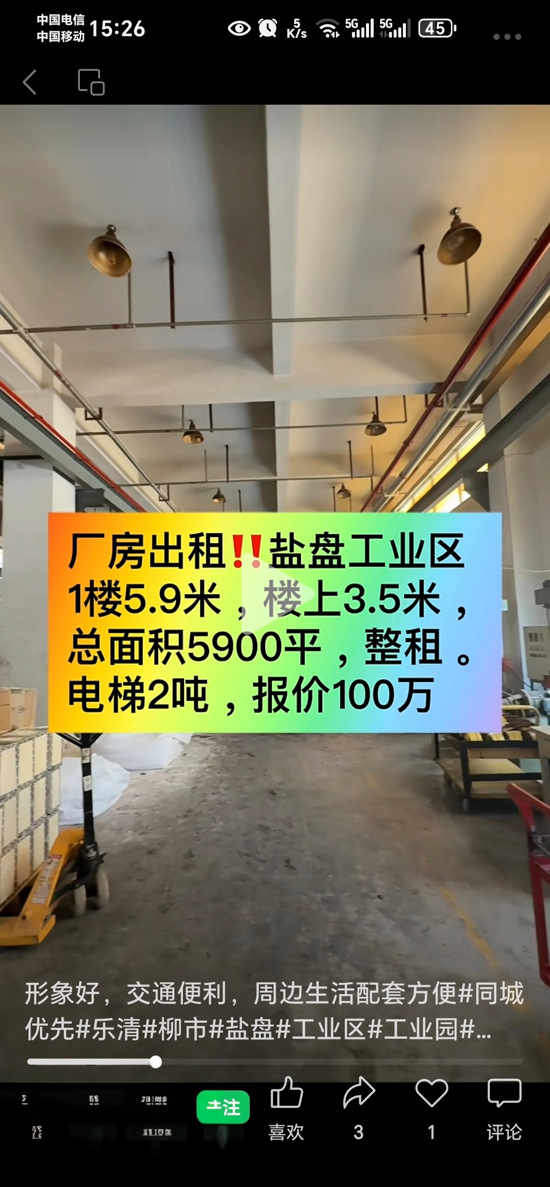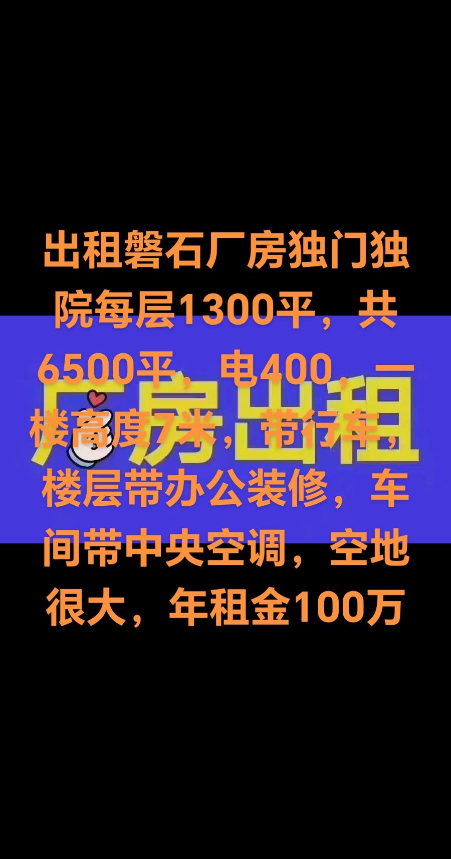 出租盐盘工业区厂房一幢每层1600平方,总共5层,合计8000平方(一楼高度5米多,二楼4米多), 边上钢架构300多平方,电梯均为2吨全新,价格优惠,均价150元,这幢变压器650千瓦和400多千瓦,
