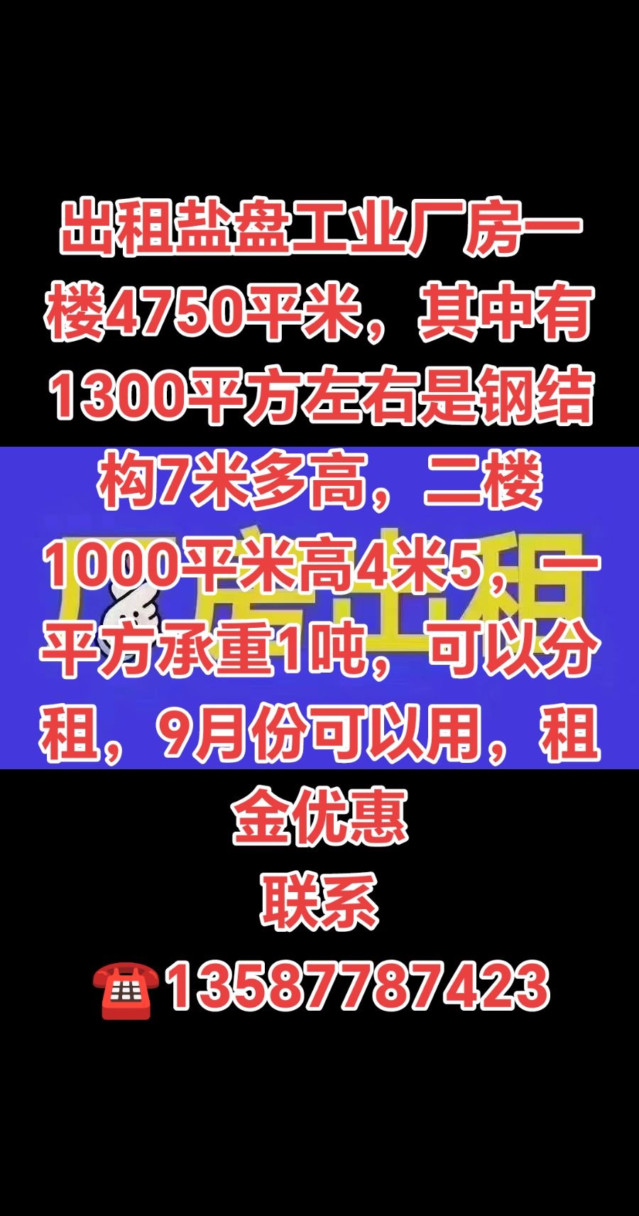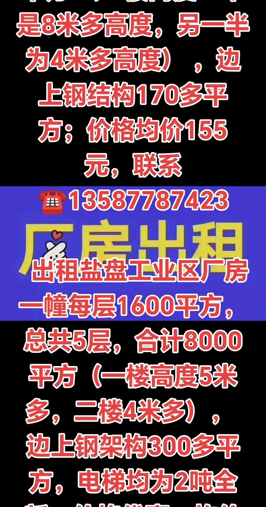 出租盐盘工业区新厂房,中心大道边上,面积930平,2楼层高5米3,承重1.2T,货梯3T,客梯一台,价格含税价160元,联系电话13587787423