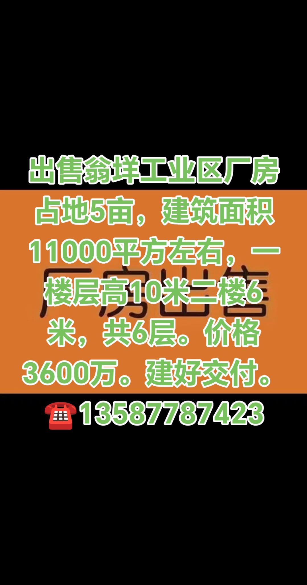 出售翁垟工业区新厂房占地5亩,建筑面积11000平方左右,一楼层高10米二楼6米,共6层。独门独户,独立证。价格3600万。建好交付。
