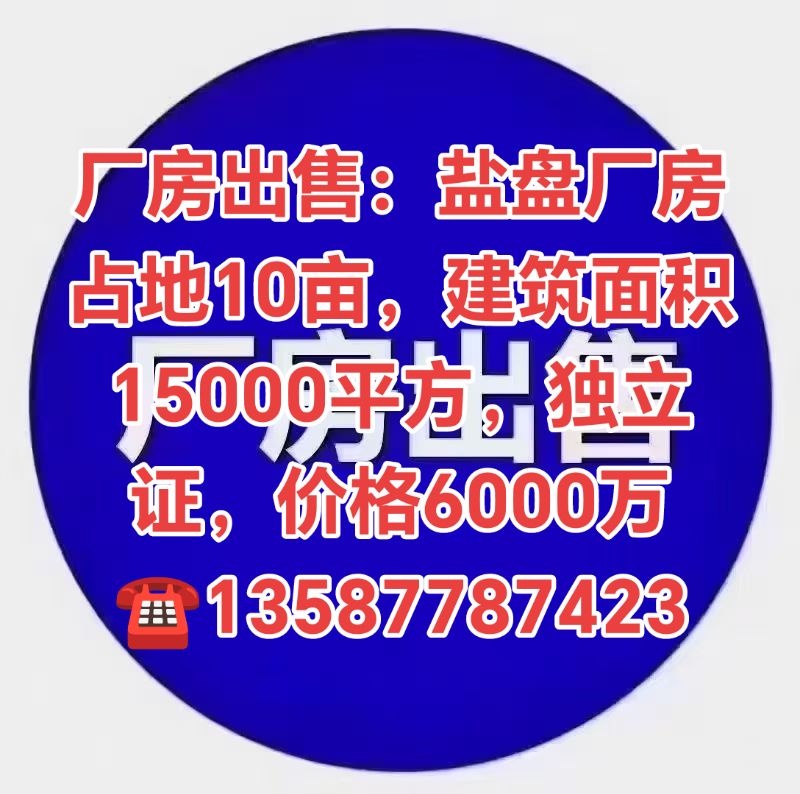 厂房出售:盐盘厂房占地10亩,建筑面积15000平方,独立证,价格6000万13587787423