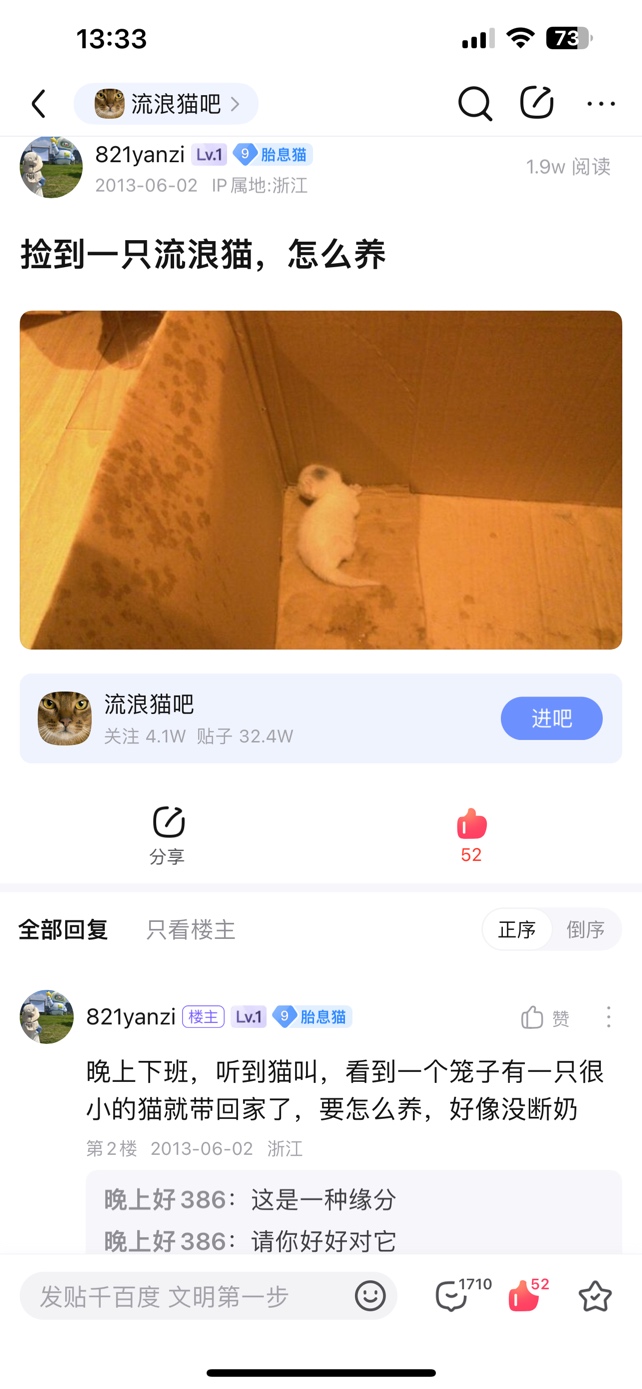本人情况:从小因为家里就养猫养狗的关系,特别喜欢小动物,两年养狗经验,十二年养猫经验,自家咪主子2013年在乐清老车站捡的,养到现在已经12岁了,在百度贴吧【流浪猫吧】记录十几年的生长过程,至今可浏览(图4有展示),期间也救助过无数流浪猫流浪狗,成功找到领养人,可以放心交给我。
