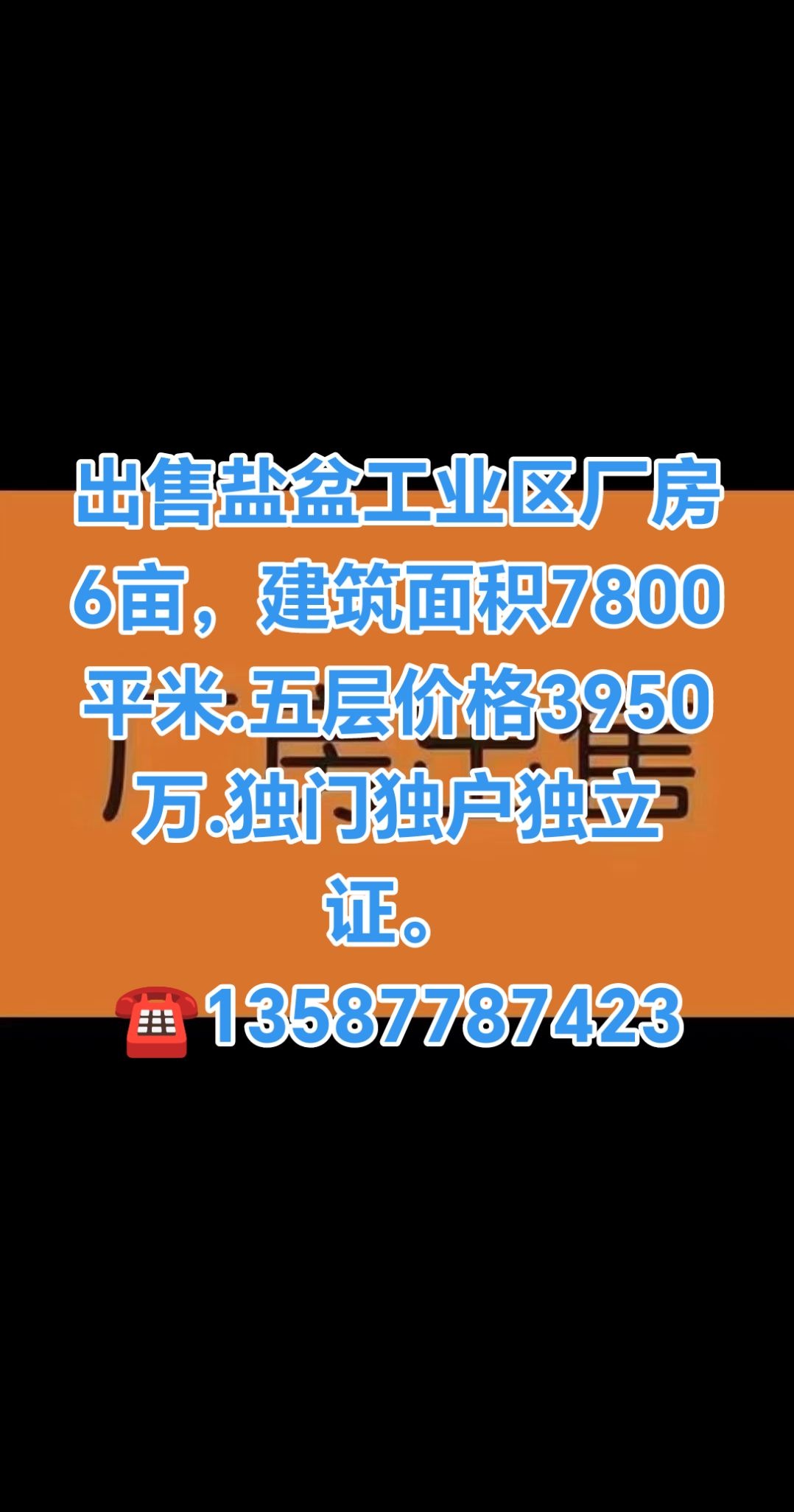 出售盐盆工业区厂房6亩,建筑面积7800平米.五层价格3950万.独门独户独立证