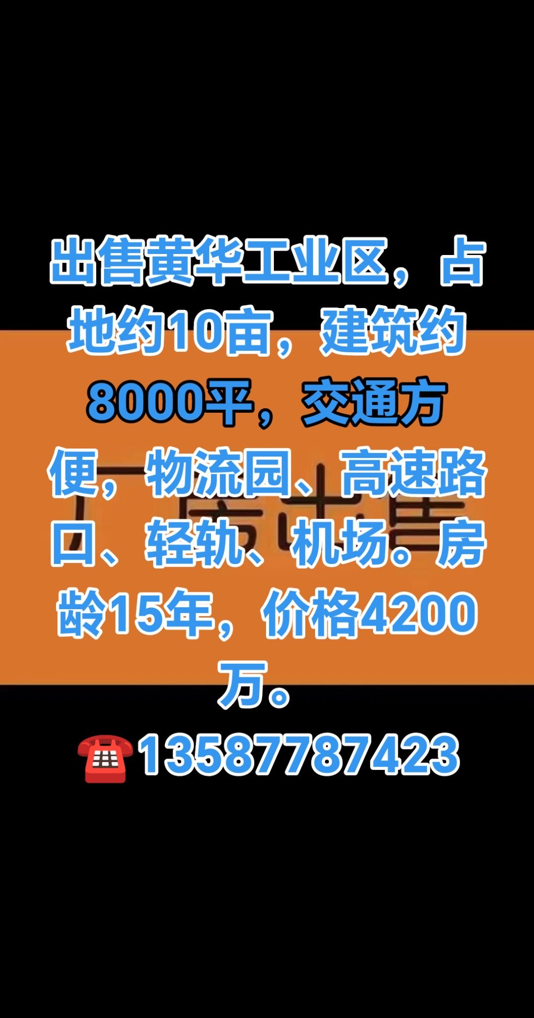 出售黄华工业区,占地约10亩,建筑约8000平,交通方便,物流园、高速路口、轻轨、机场。房龄15年,价格4200万。