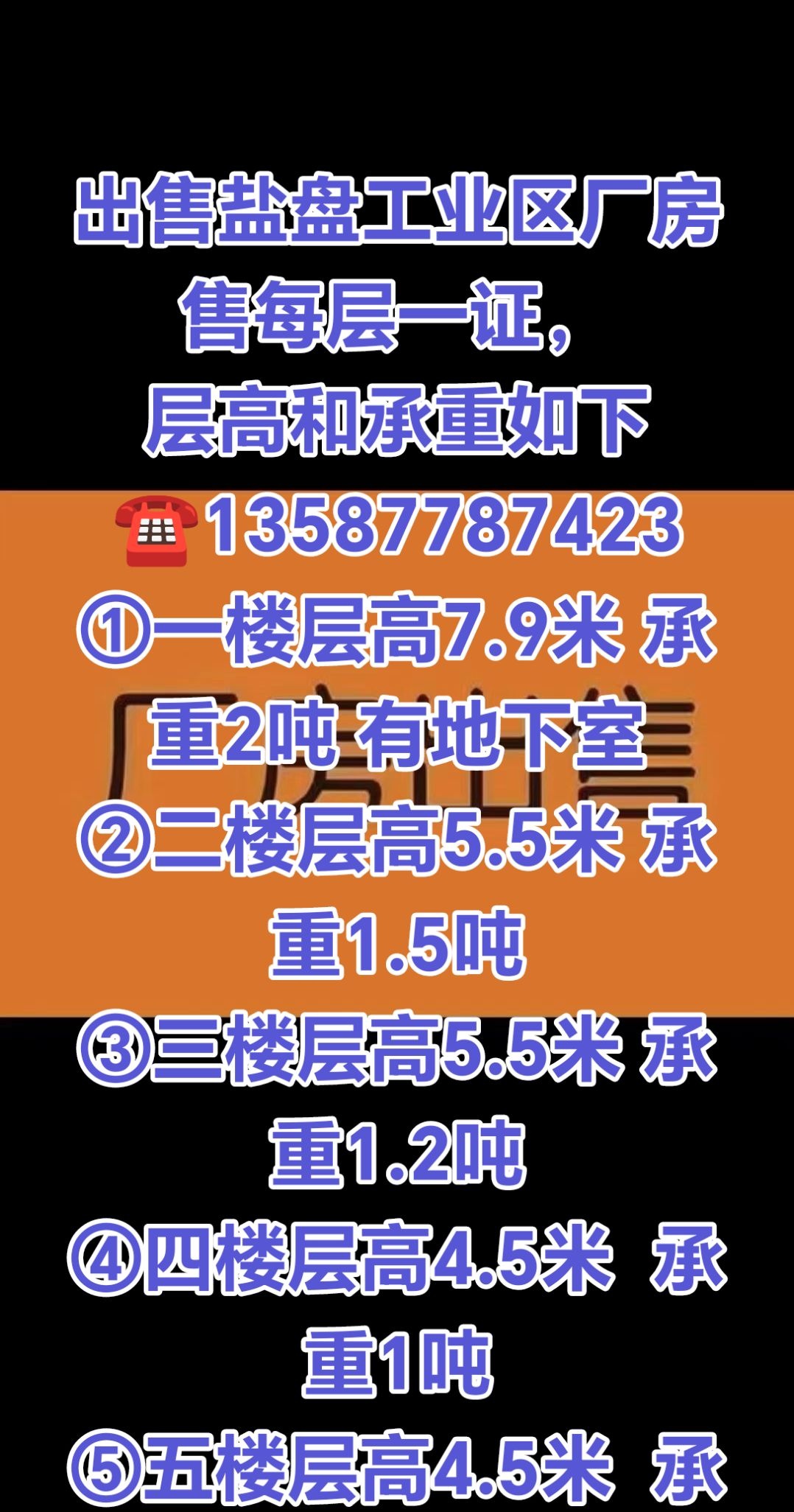 出售盐盘工业区厂房每层一证, 13587787423 ①一楼层高7.9米 承