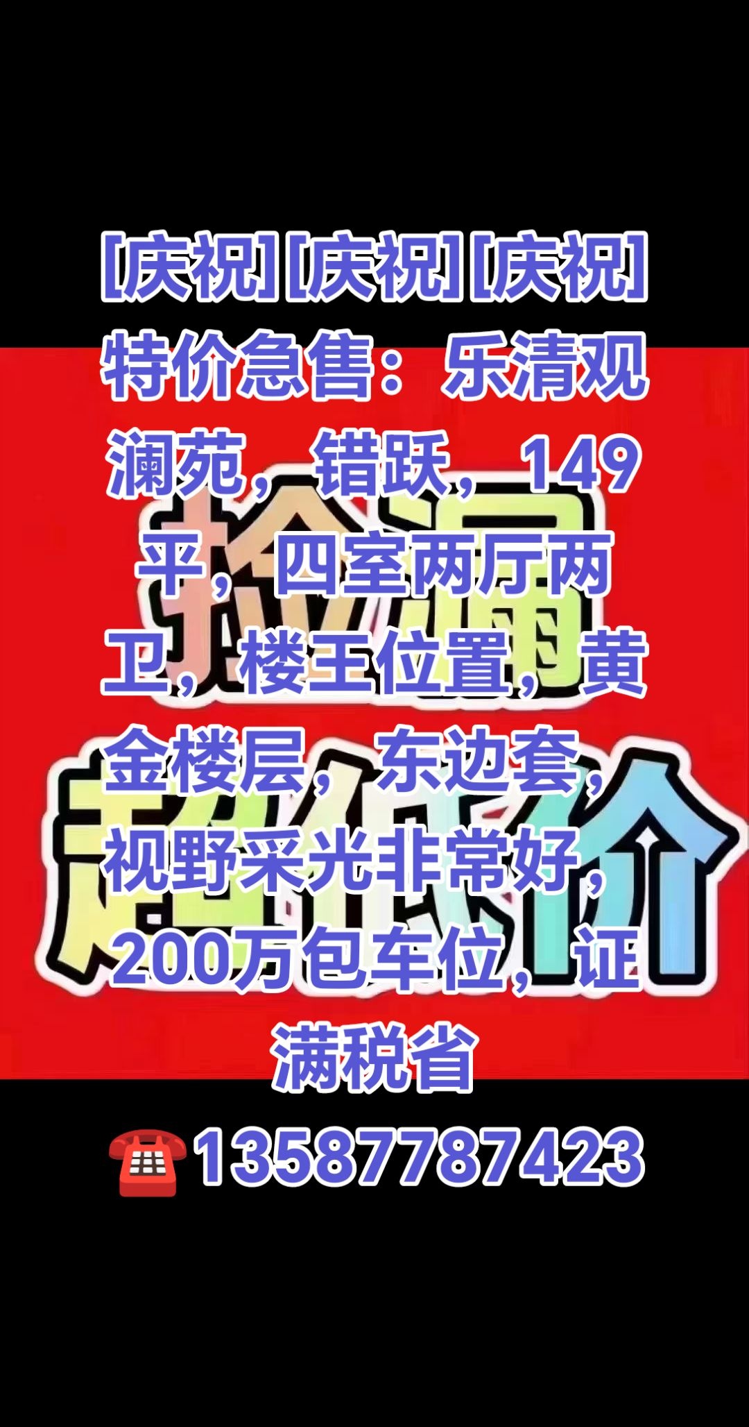 [庆祝][庆祝][庆祝]特价急售:乐清观澜苑,错跃,149平,四室两厅两卫,楼王位置,黄金楼层,东边套,视野采光非常好,200万包车位,证满税省13587787423