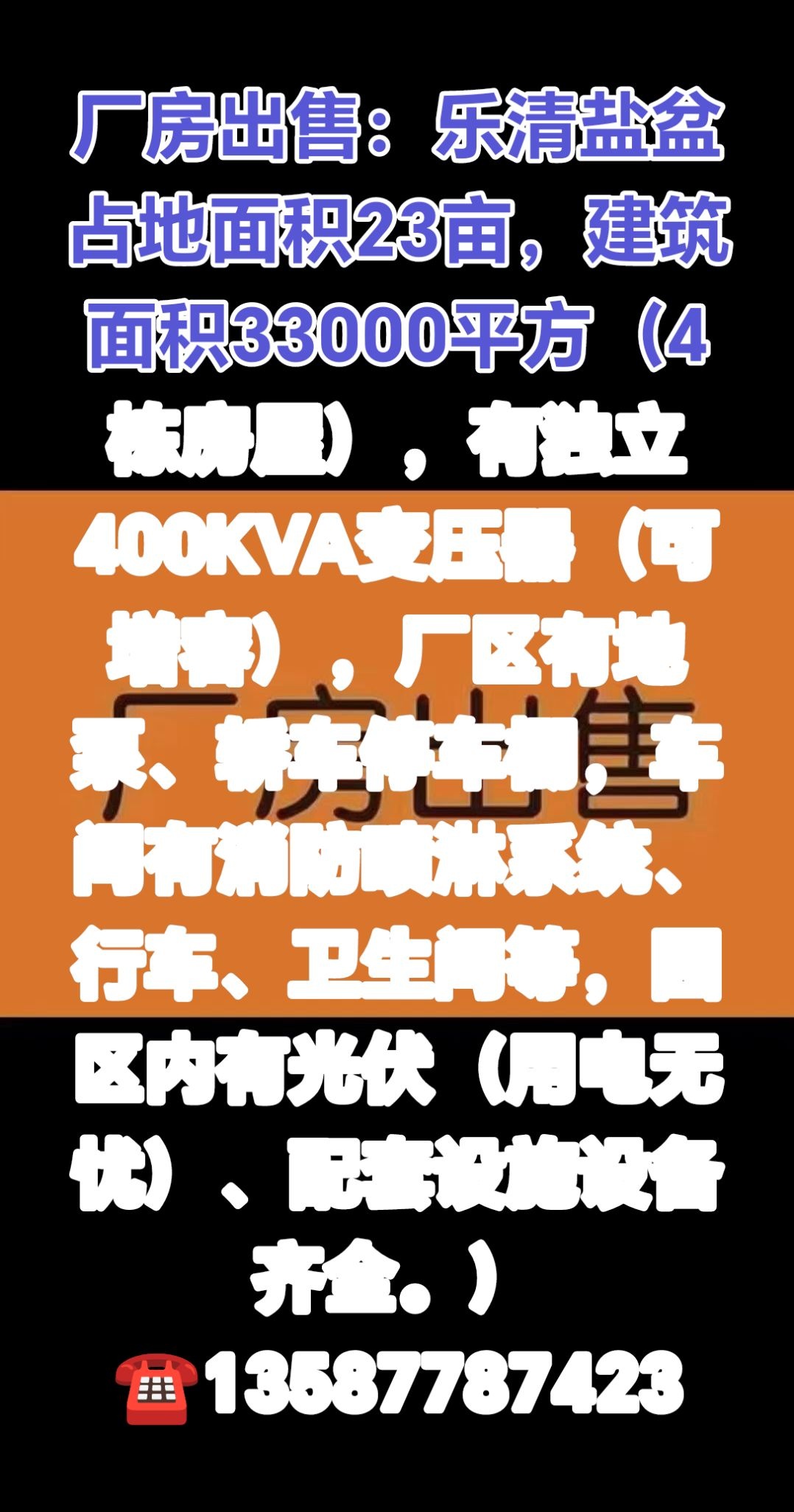 厂房出售:乐清盐盆占地面积23亩,建筑面积33000平方(4栋房屋),有独立40