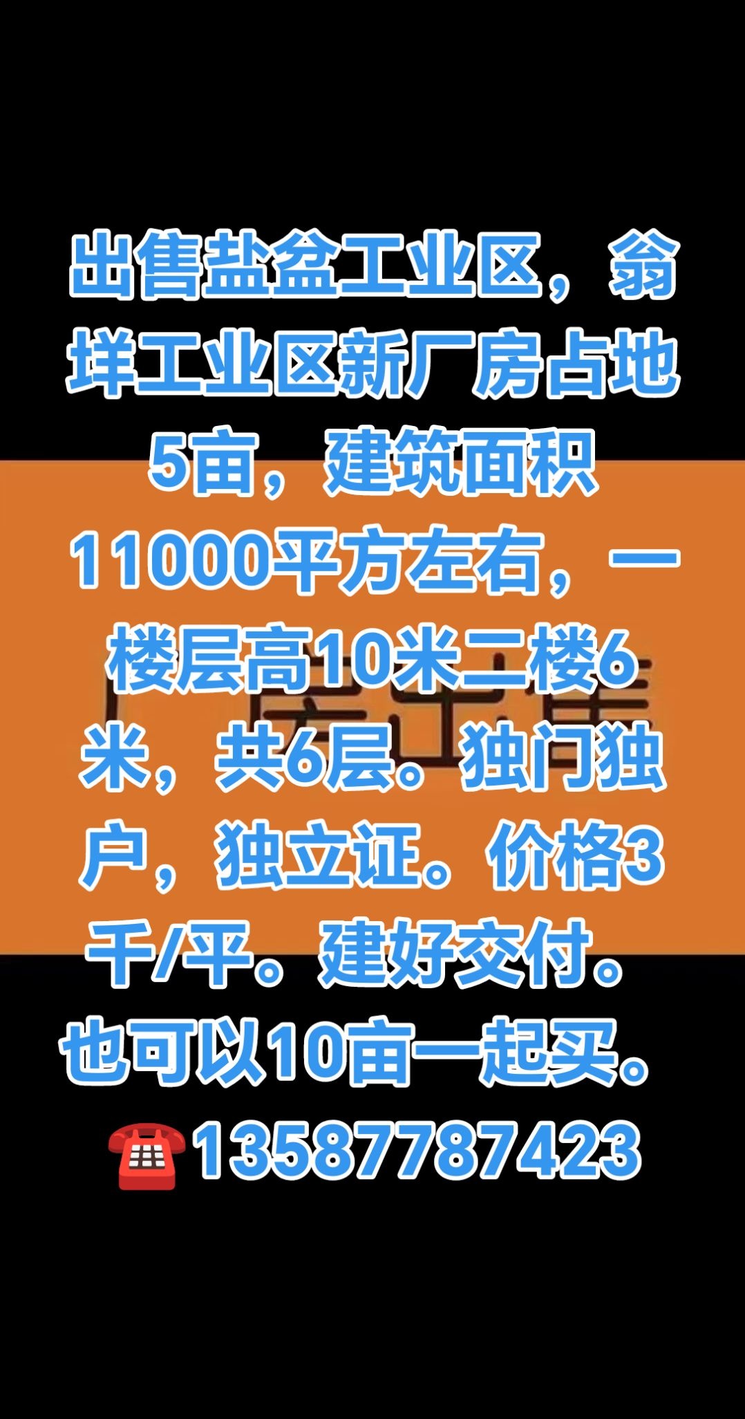 出售厂房,盐盆工业区,翁垟工业区新厂房占地5亩,建筑面积11000平方左右,一楼层高10米二楼6米,共6层。独门独户,独立证。价格3千/平。建好交付。也可以10亩一起买。13587787423
