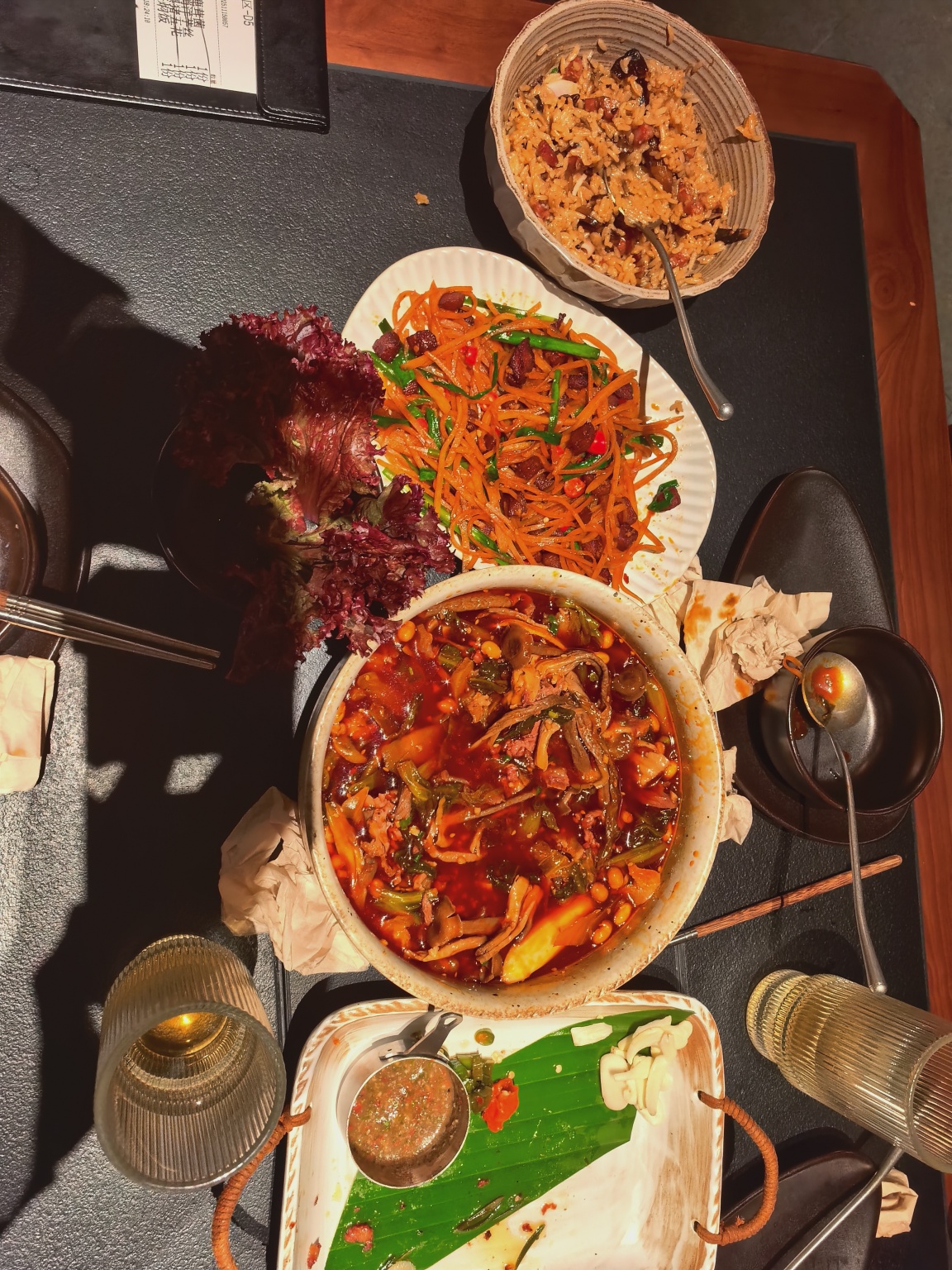 环境氛围:梅果位于乐清南虹广场 4 楼,店内是暗调自然山野风。灯光设计富有高级感,营造出沉浸式云贵川风情,很适合拍照打卡。