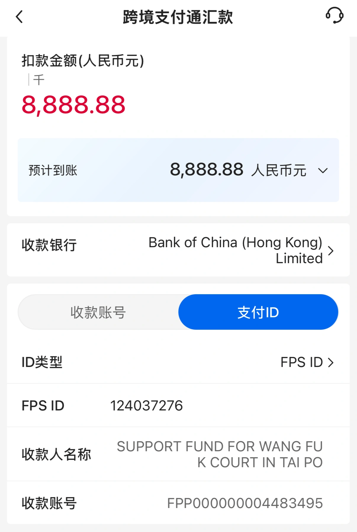 收款人自动显示为Support Fund for Wang Fuk Court in Tai Po(大埔宏福苑援助基金,一定要核对收款人名称,别捐错地方了)