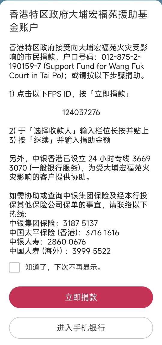 用各银行跨境支付通功能对香港大埔宏福苑火灾直接捐款,不经由国内第三方