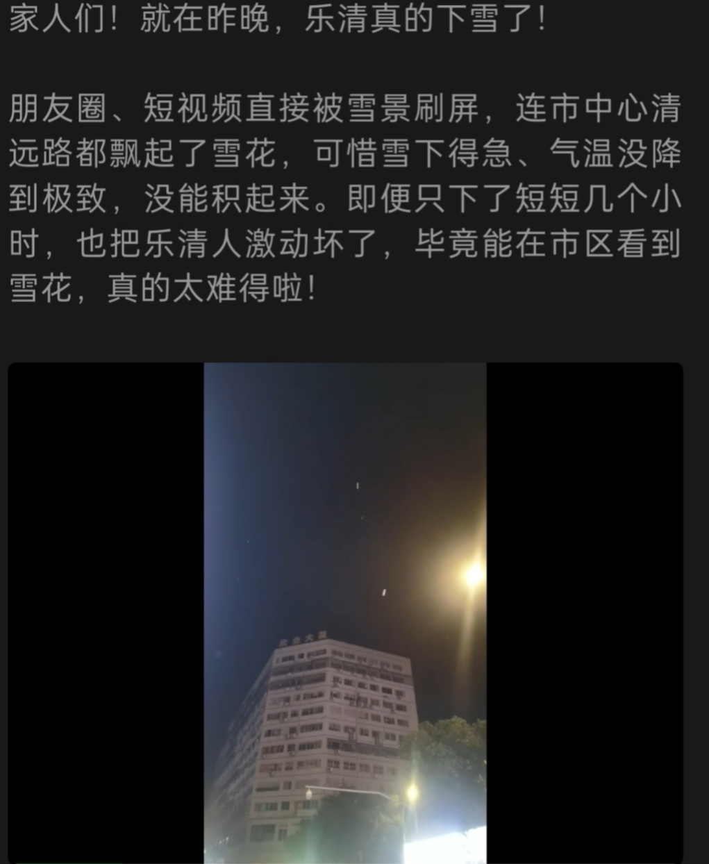 你们都说昨晚乐清下雪了,我在市区外疏港大道(虹卫闸门)附近怎么就没看见雪花,是昨晚几点下了?