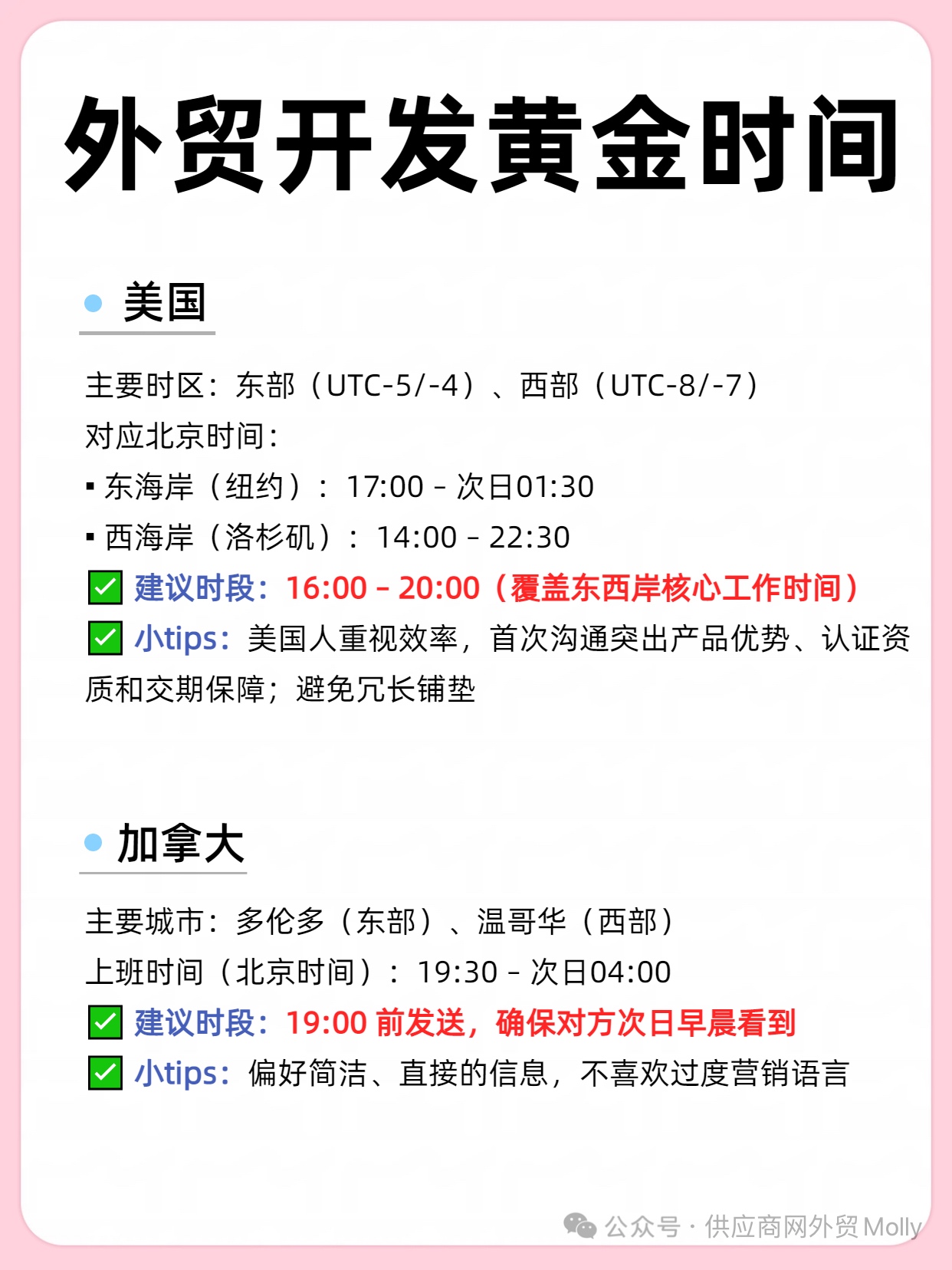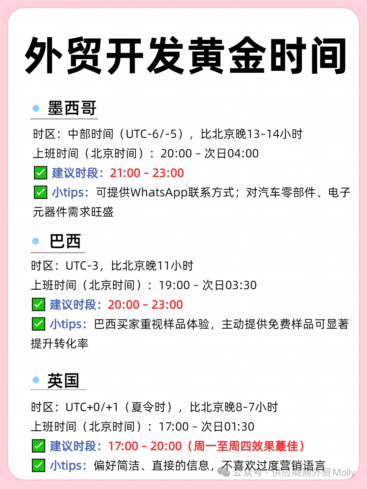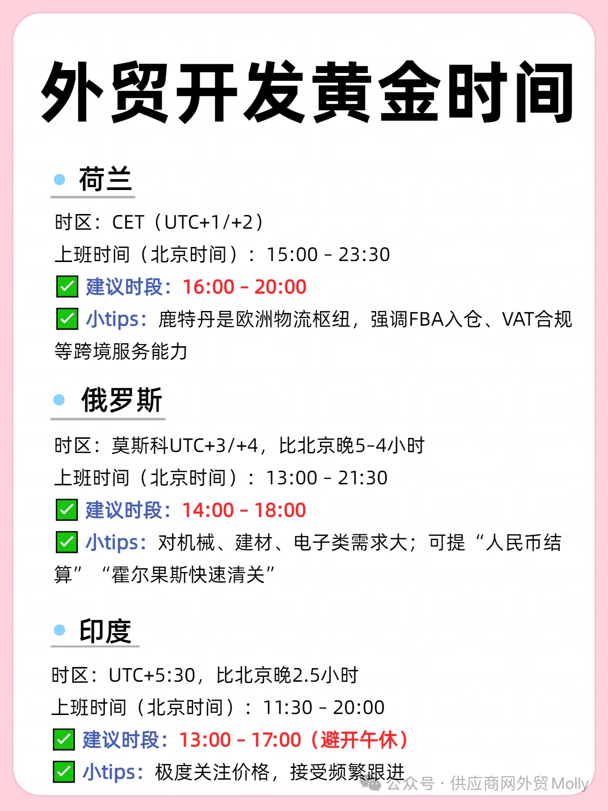 今天梳理了十几个外贸高频国家的最佳联系时间(以北京时间为基准),并结合当地文化习惯提供实用沟通建议,助你精 准触达、高 效转化!