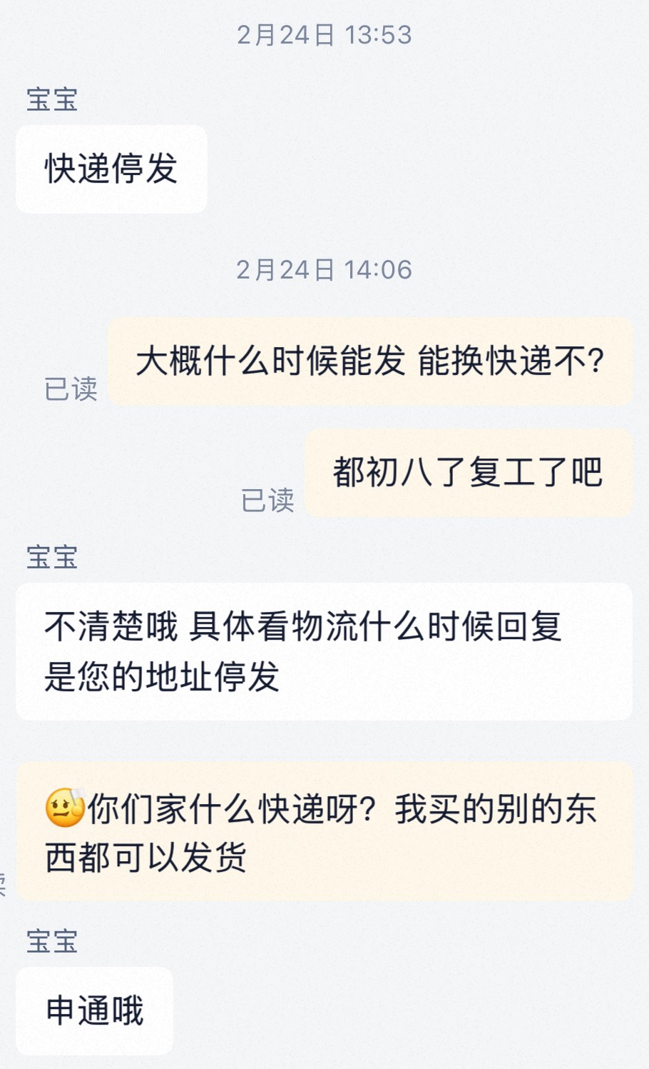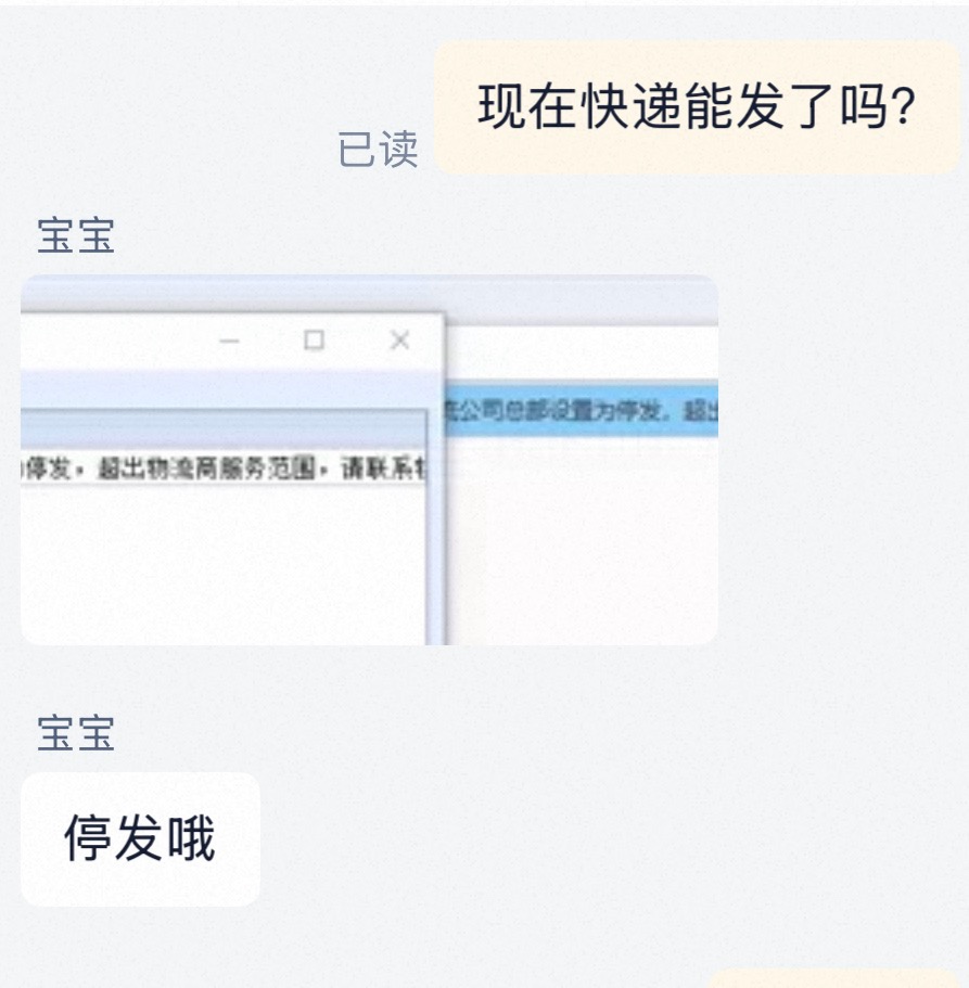 淘宝卖家那边快递一直发不出来,初八去问的时候说停发,前两天问还是说发不出来。